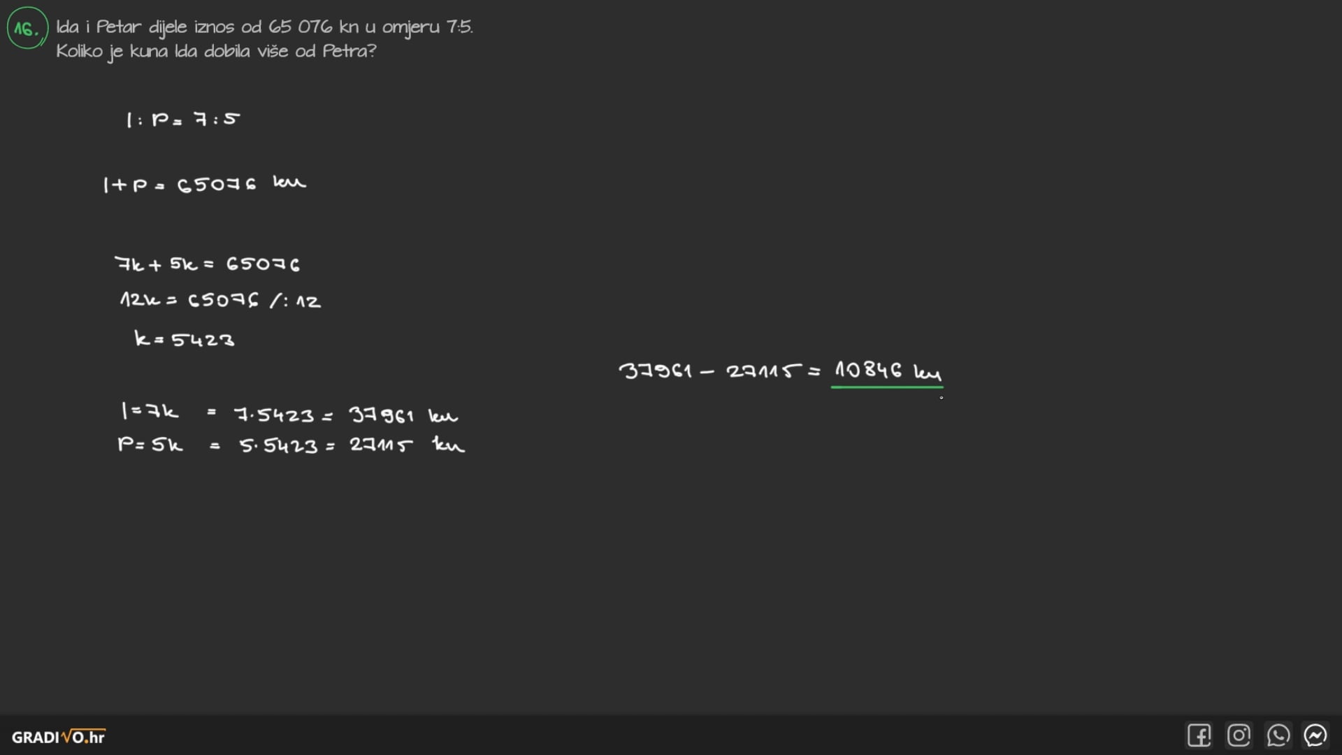 Ida i Petar dijele iznos od 65 076 kn u omjeru $7: 5$. Koliko je kuna Ida dobila više od Petra?