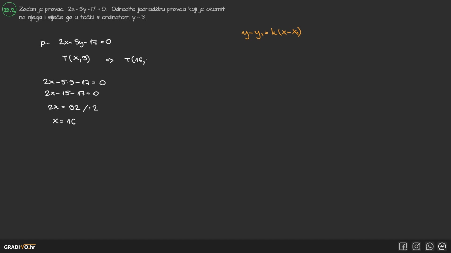 Zadan je pravac $2 x-5 y-17=0$. Odredite jednadžbu pravca koji je okomit na njega i siječe ga u točki s ordinatom $y=3$.