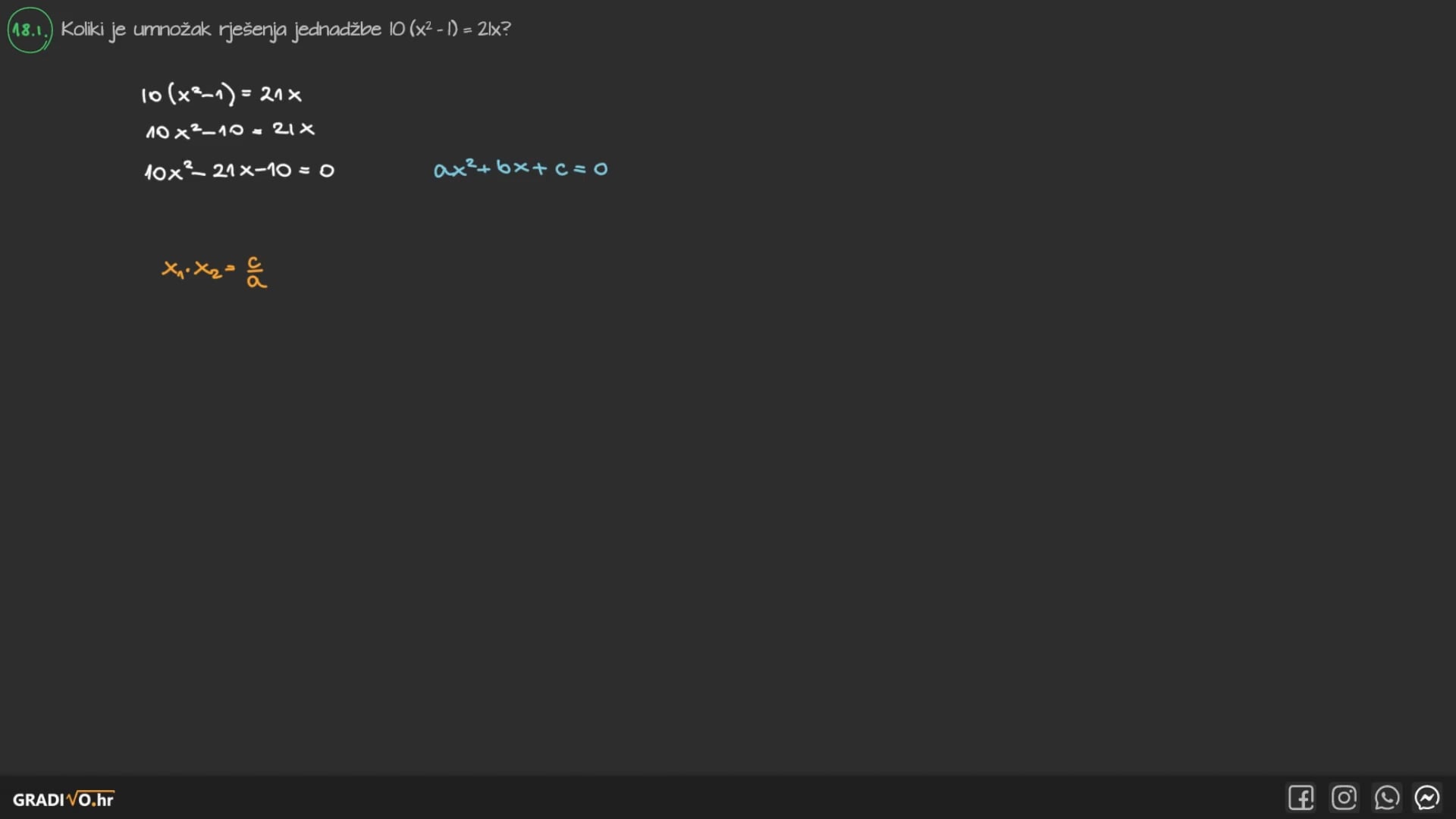 Koliki je umnožak rješenja jednadžbe $10\left(x^{2}-1\right)=21 x$ ?