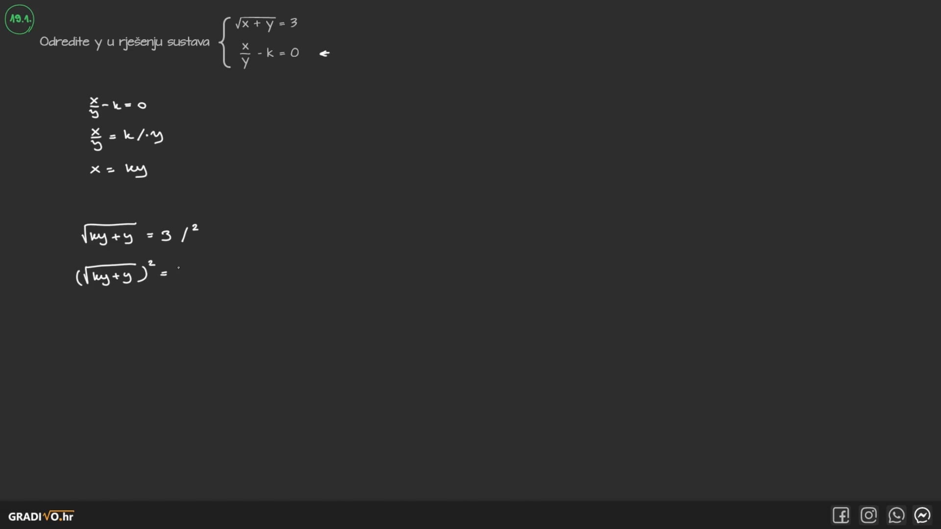 Odredite $y$ u rješenju sustava $\left\{\begin{array}{l}\sqrt{x+y}=3 \\ \frac{x}{y}-k=0\end{array}\right.$.