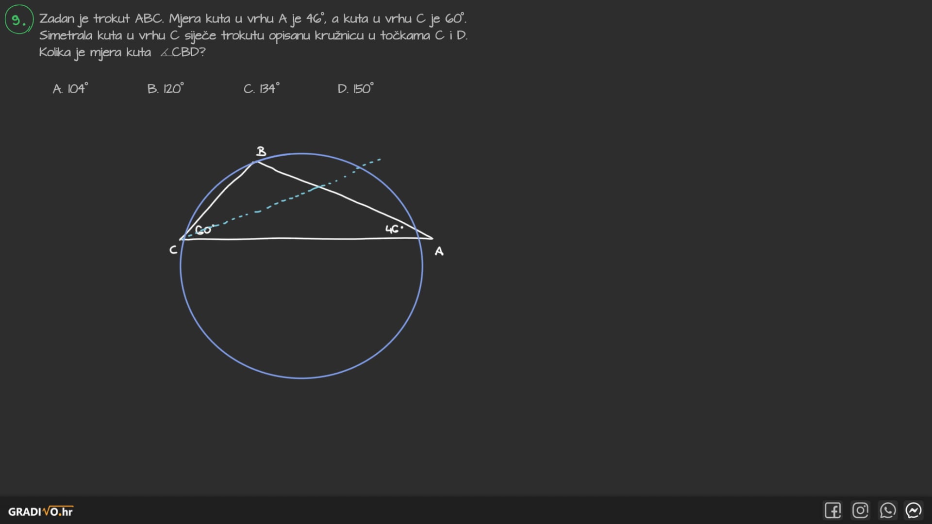 Zadan je trokut $A B C$. Mjera kuta u vrhu $A$ je $46^{\circ}$, a kuta u vrhu $C$ je $60^{\circ}$. Simetrala kuta u vrhu $C$ siječe trokutu opisanu kružnicu u točkama $C$ i $D$. Kolika je mjera kuta $\angle C B D$ ?