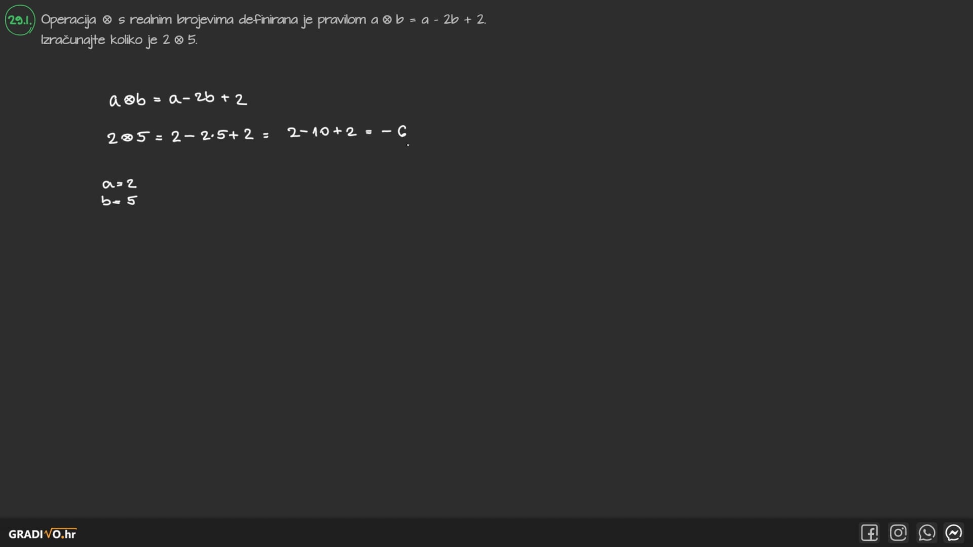 Operacija \(\otimes \mathrm{s}\) realnim brojevima definirana je pravilom \(a \otimes b=a-2 b+2\). Izračunajte koliko je \(2 \otimes 5\).