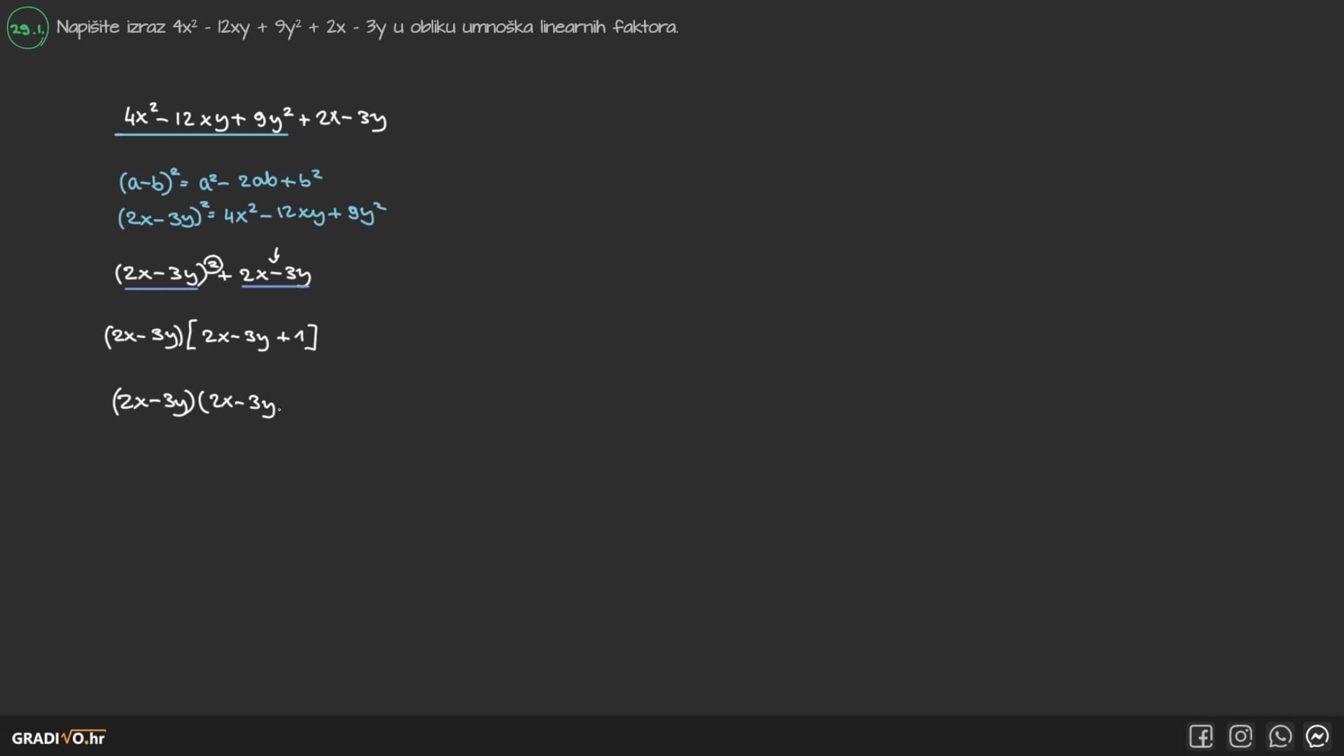 Napišite izraz $4 x^{2}-12 x y+9 y^{2}+2 x-3 y$ u obliku umnoška linearnih faktora.