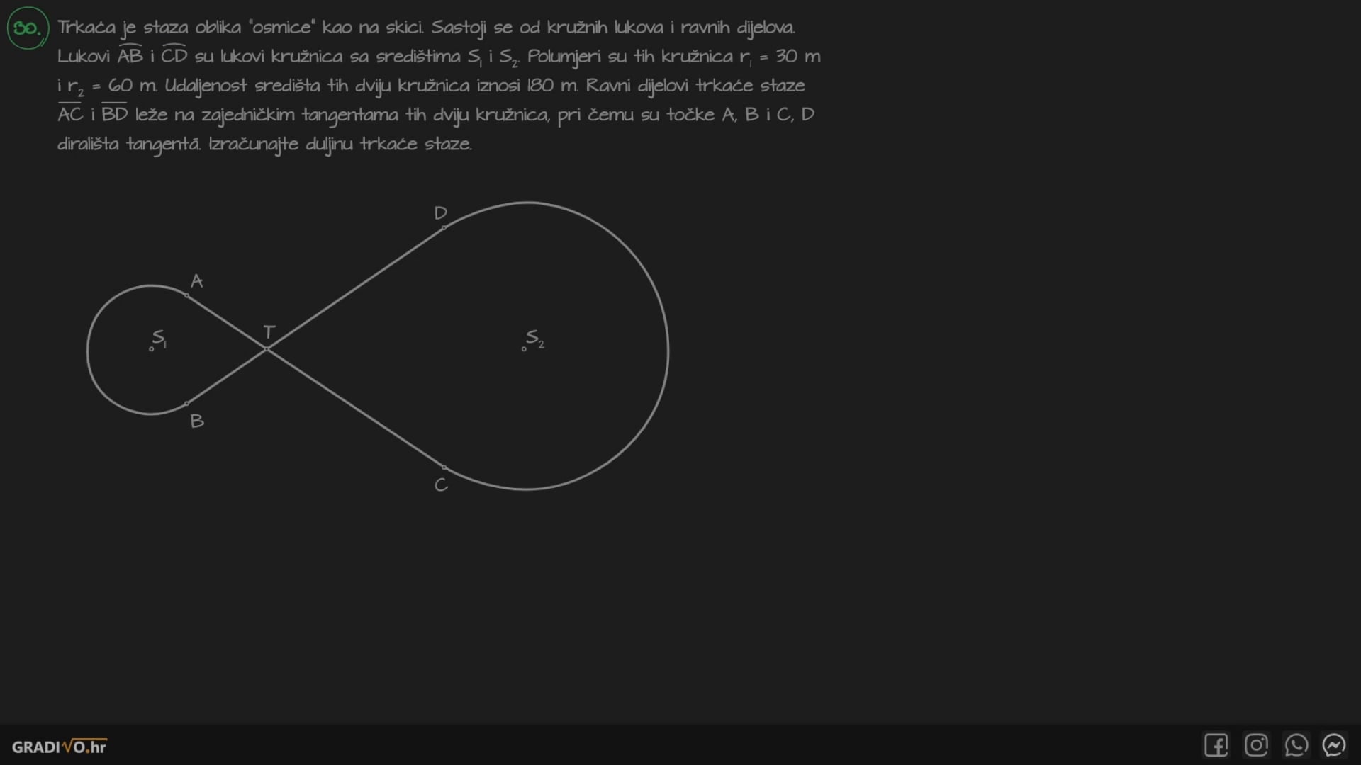 Trkaća je staza oblika ,,osmice'' kao na skici. Sastoji se od kružnih lukova i ravnih dijelova. Lukovi $\overset{\frown}{AB}$ i $\overset{\frown}{CD}$ su lukovi kružnica sa središtima $S_1$ i $S_2$. Polumjeri su tih kružnica $r_1 = 30 \ \text{m}$ i $r_2 = 60 \ \text{m}$. Udaljenost središta tih dviju kružnica iznosi $180 \ \text{m}$. Ravni dijelovi trkaće staze $\overline{AC}$ i $\overline{BD}$ leže na zajedničkim tangentama tih dviju kružnica, pri čemu su točke $A$, $B$, $C$, $D$ dirališta tangenta. Izračunajte duljinu trkaće staze.