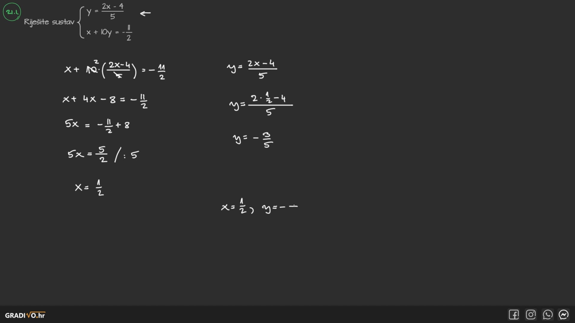 Riješite sustav $\left\{\begin{array}{l}y=\frac{2 x-4}{5} \\ x+10 y=-\frac{11}{2}\end{array}\right.$.