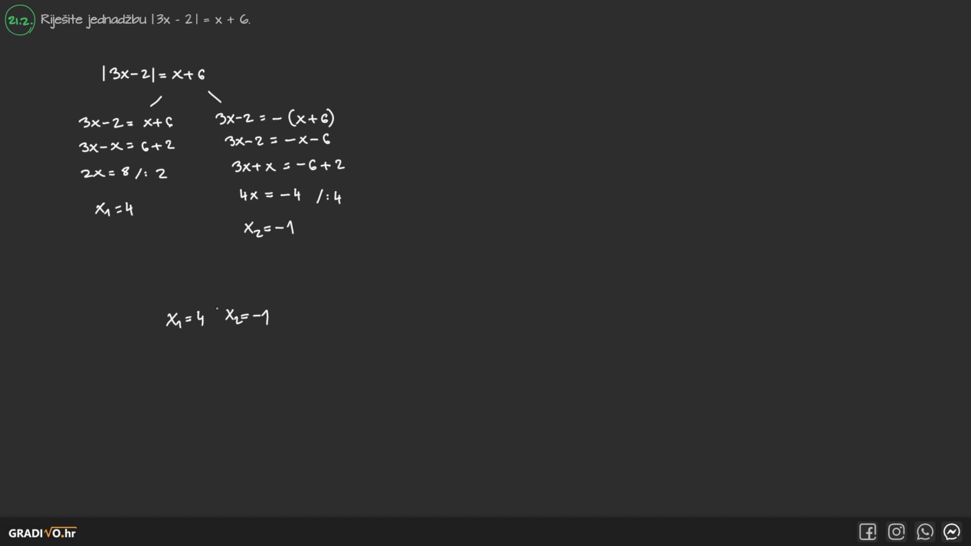 Riješite jednadžbu $|3 x-2|=x+6$.