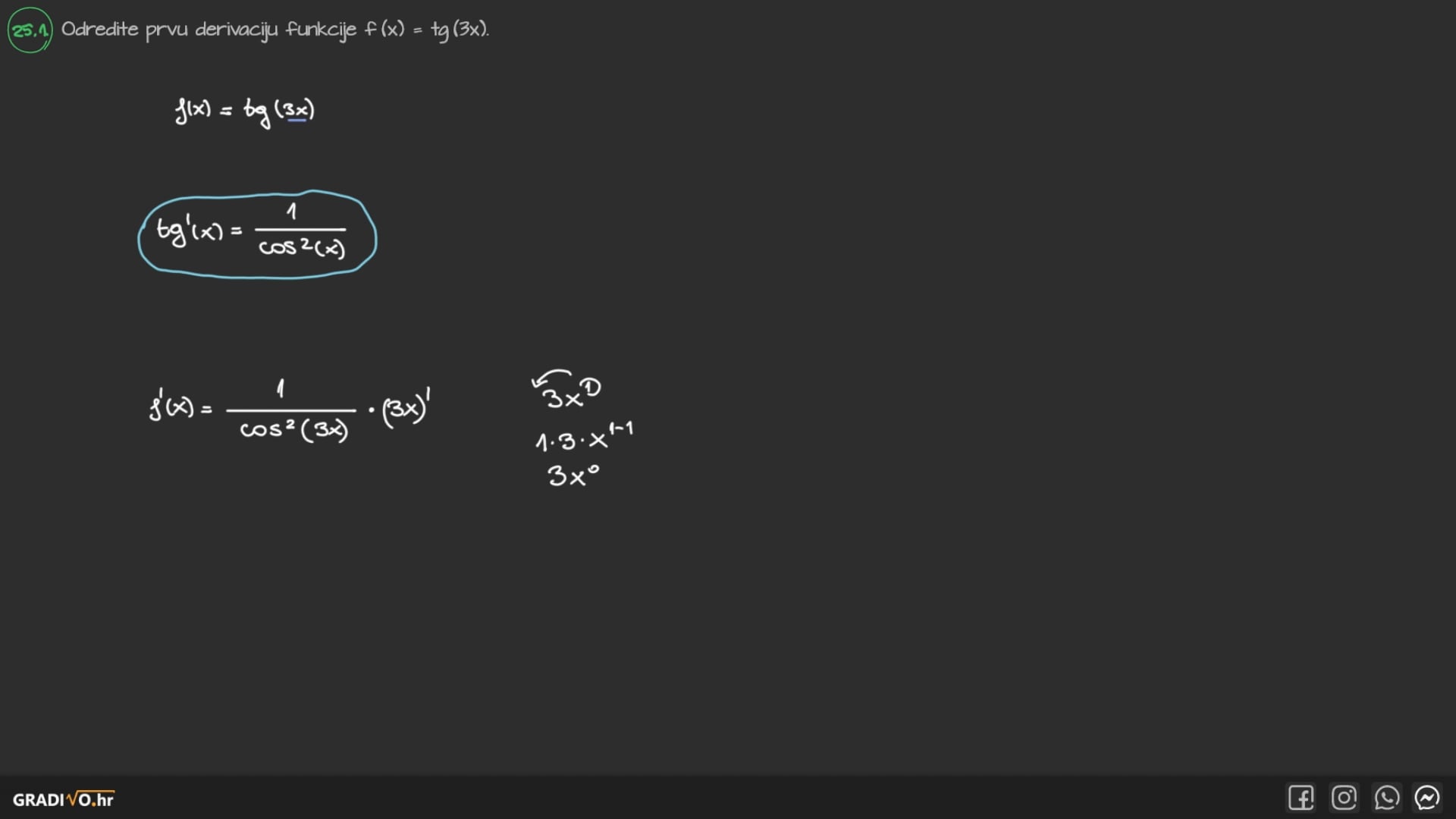 Odredite prvu derivaciju funkcije $f(x)=\operatorname{tg}(3 x)$.