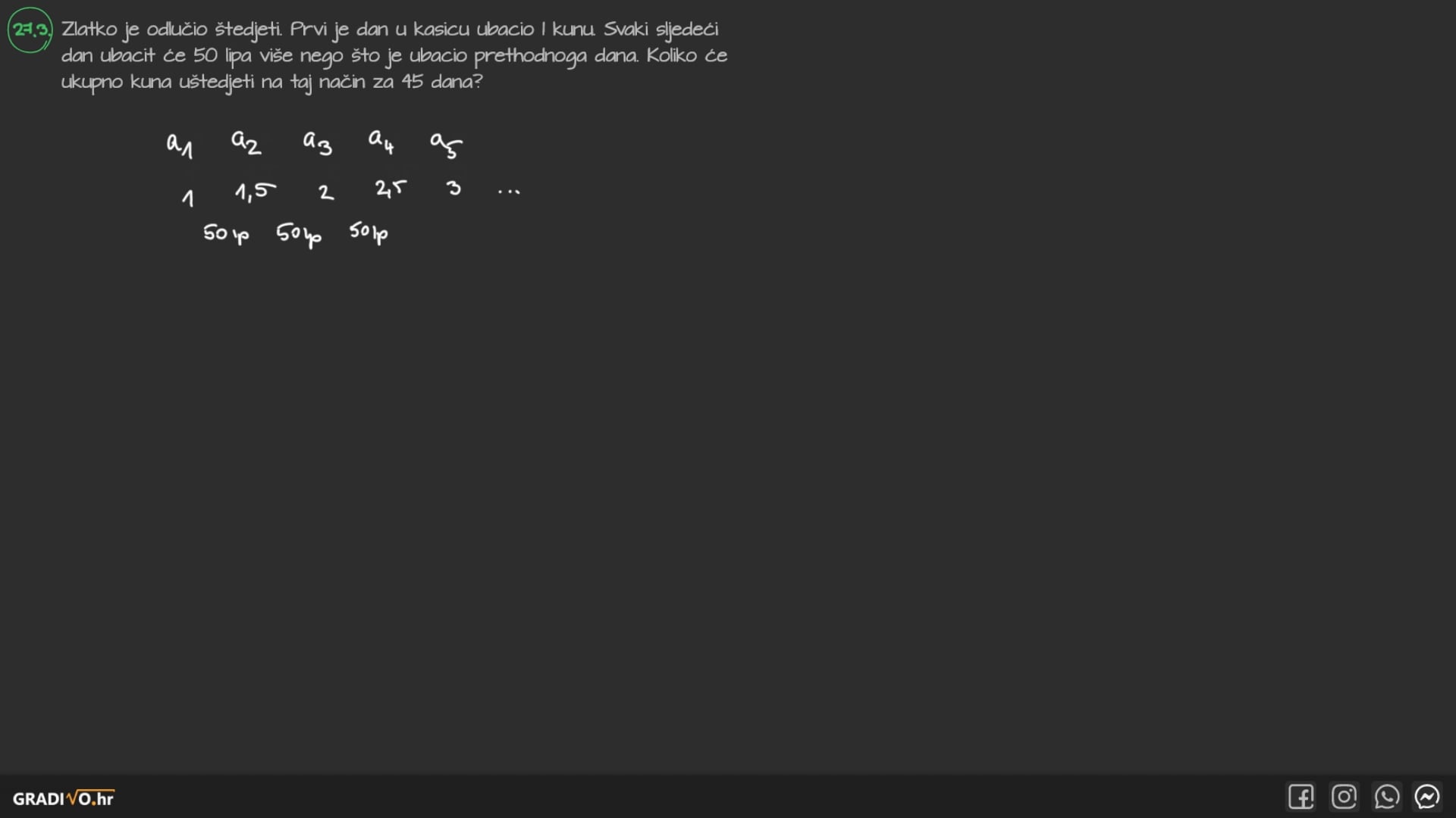 Zlatko je odlučio štedjeti. Prvi je dan u kasicu ubacio 1 kunu. Svaki sljedeći dan ubacit će 50 lipa više nego što je ubacio prethodnoga dana. Koliko će ukupno kuna uštedjeti na taj način za 45 dana?