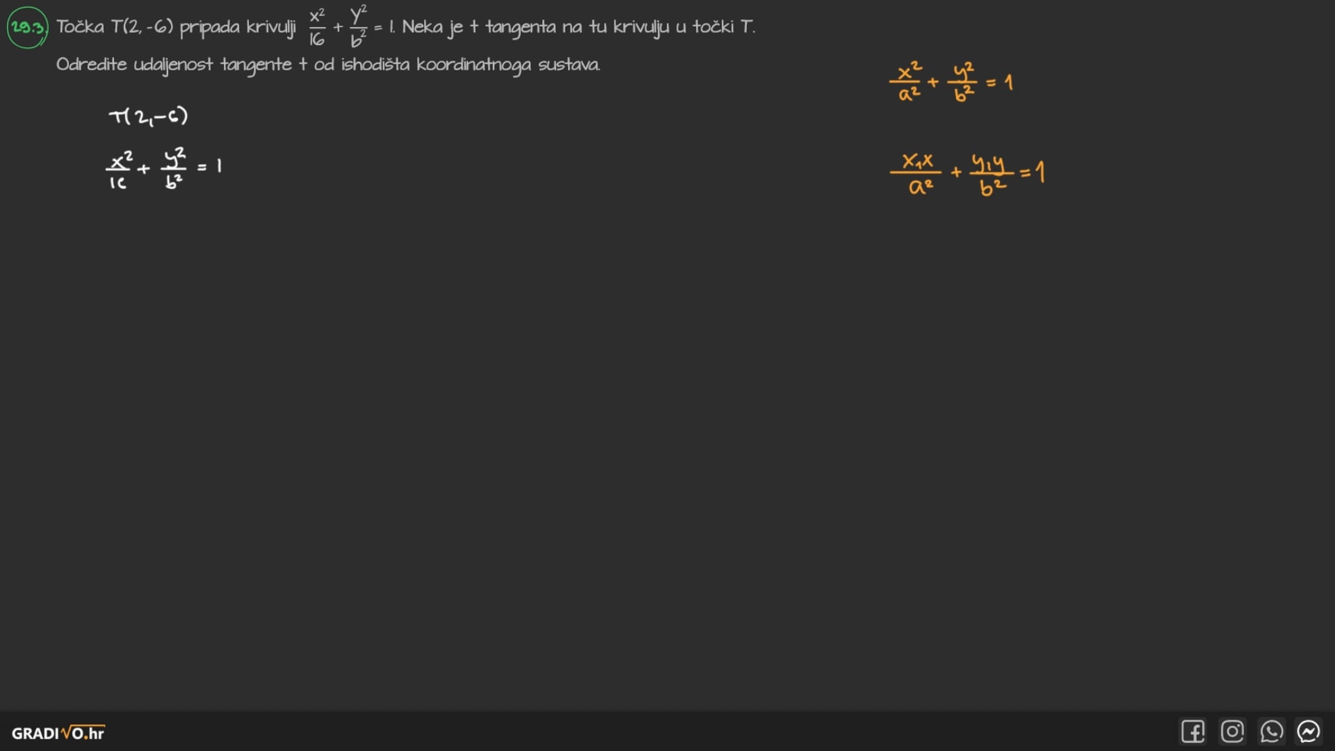 Točka $T(2,-6)$ pripada krivulji $\frac{x^{2}}{16}+\frac{y^{2}}{b^{2}}=1$. Neka je $t$ tangenta na tu krivulju u točki $T$. Odredite udaljenost tangente $t$ od ishodišta koordinatnoga sustava.