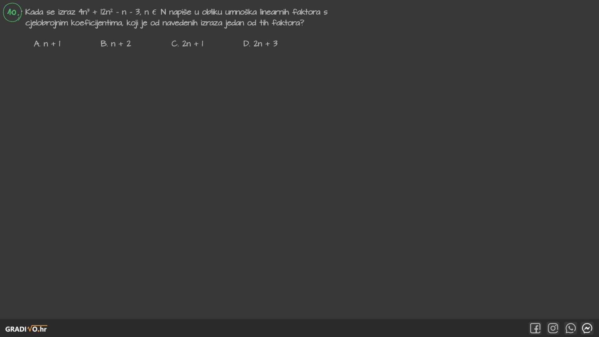 Kada se izraz $4 n^{3}+12 n^{2}-n-3, n \in \mathbf{N}$ napiše u obliku umnoška linearnih faktora s cjelobrojnim koeficijentima, koji je od navedenih izraza jedan od tih faktora?