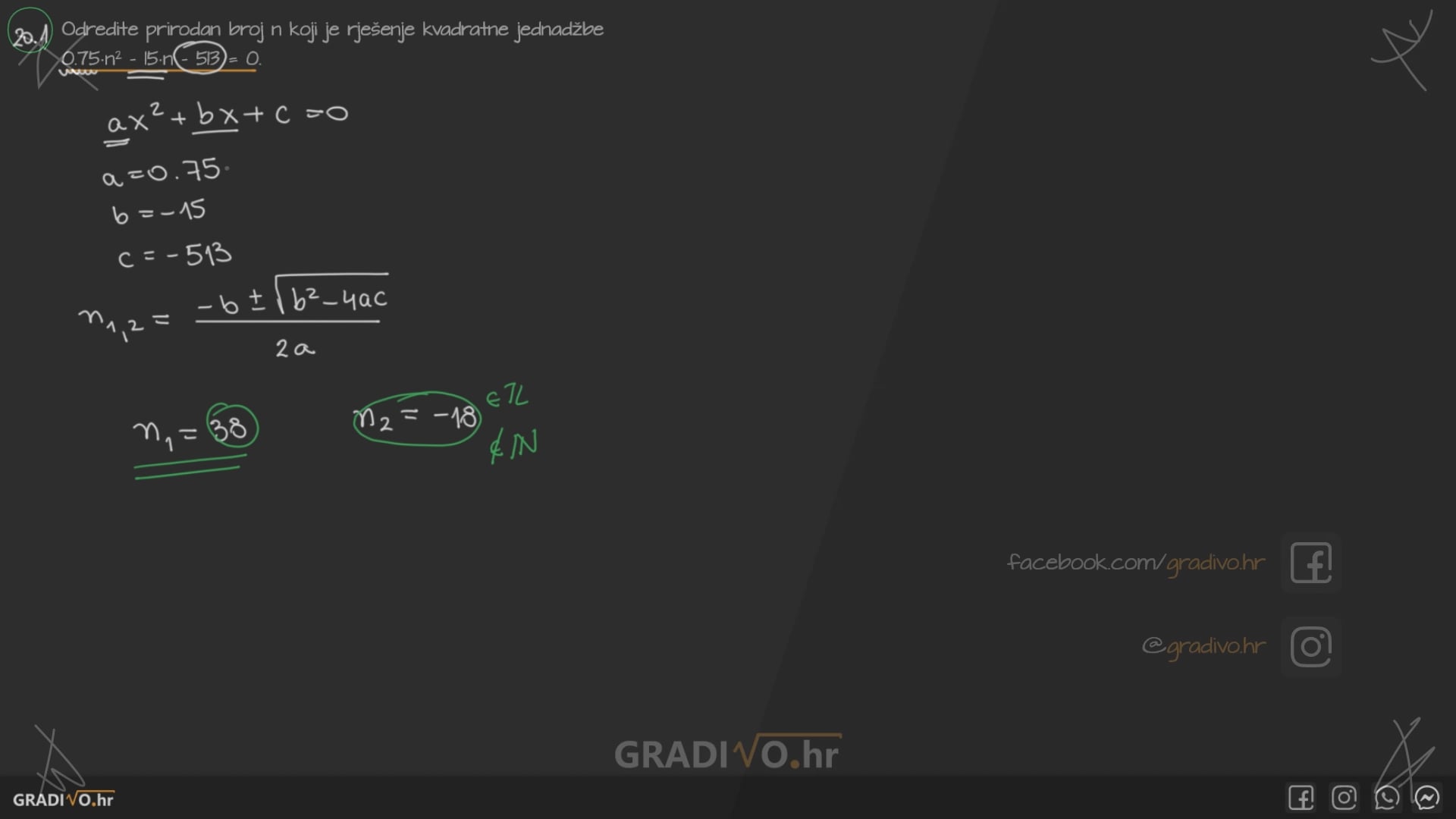 Odredite prirodan broj $n$ koji je rješenje kvadratne jednadžbe $0.75 \cdot n^{2}-15 \cdot n-513=0$