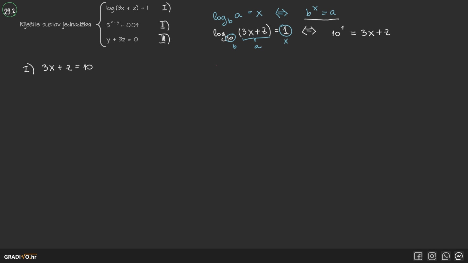 Riješite sustav jednadžba $\left\{\begin{array}{l}\log (3 x+z)=1 \\ 5^{x-y}=0.04 \\ y+3 z=0\end{array}\right.$
