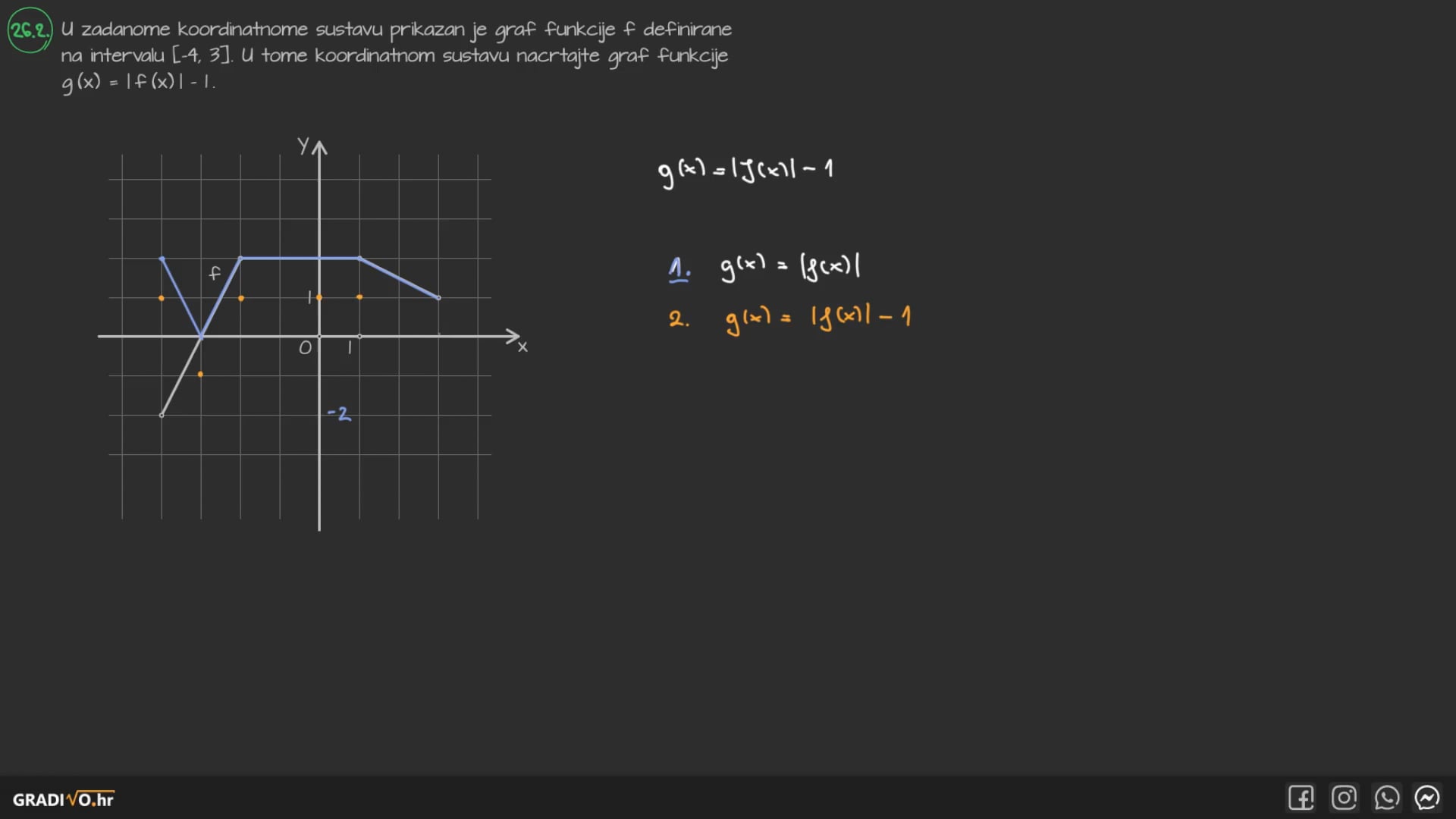 U zadanome koordinatnome sustavu prikazan je graf funkcije $f$ definirane na intervalu $[-4,3]$. U tome koordinatnom sustavu nacrtajte graf funkcije $g(x)=|f(x)|-1$