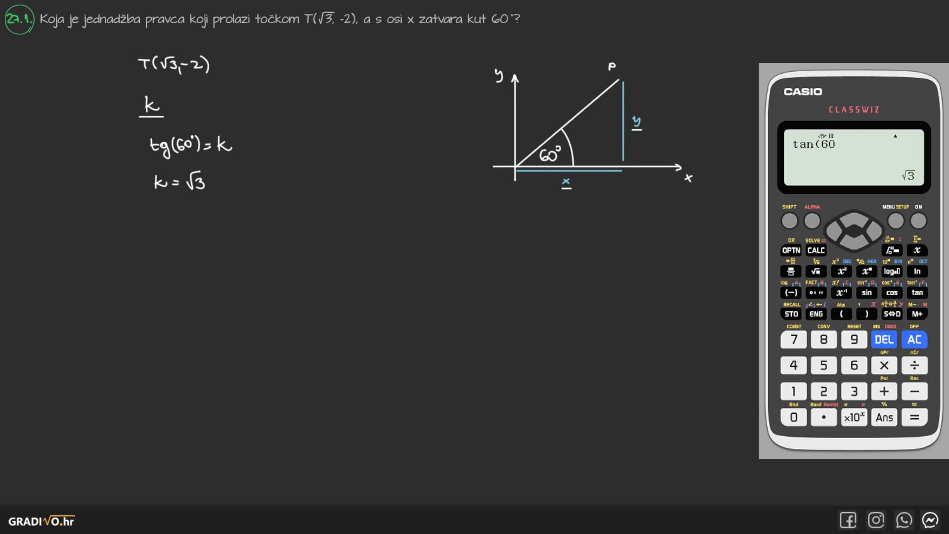 Koja je jednadžba pravca koji prolazi točkom $T(\sqrt{3},-2)$, a s osi $x$ zatvara kut $60^{\circ}$ ?