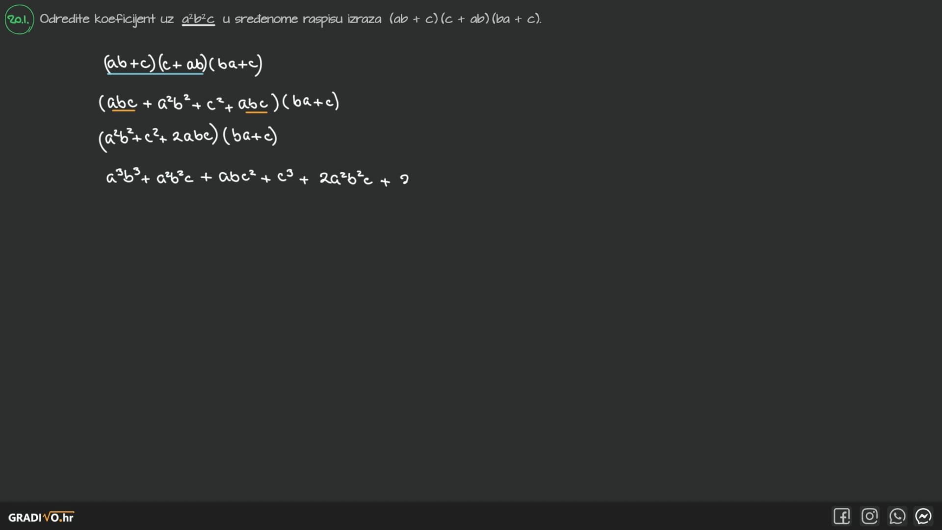 Odredite koeficijent uz $a^{2} b^{2} c$ u sređenome raspisu izraza $(a b+c)(c+a b)(b a+c)$