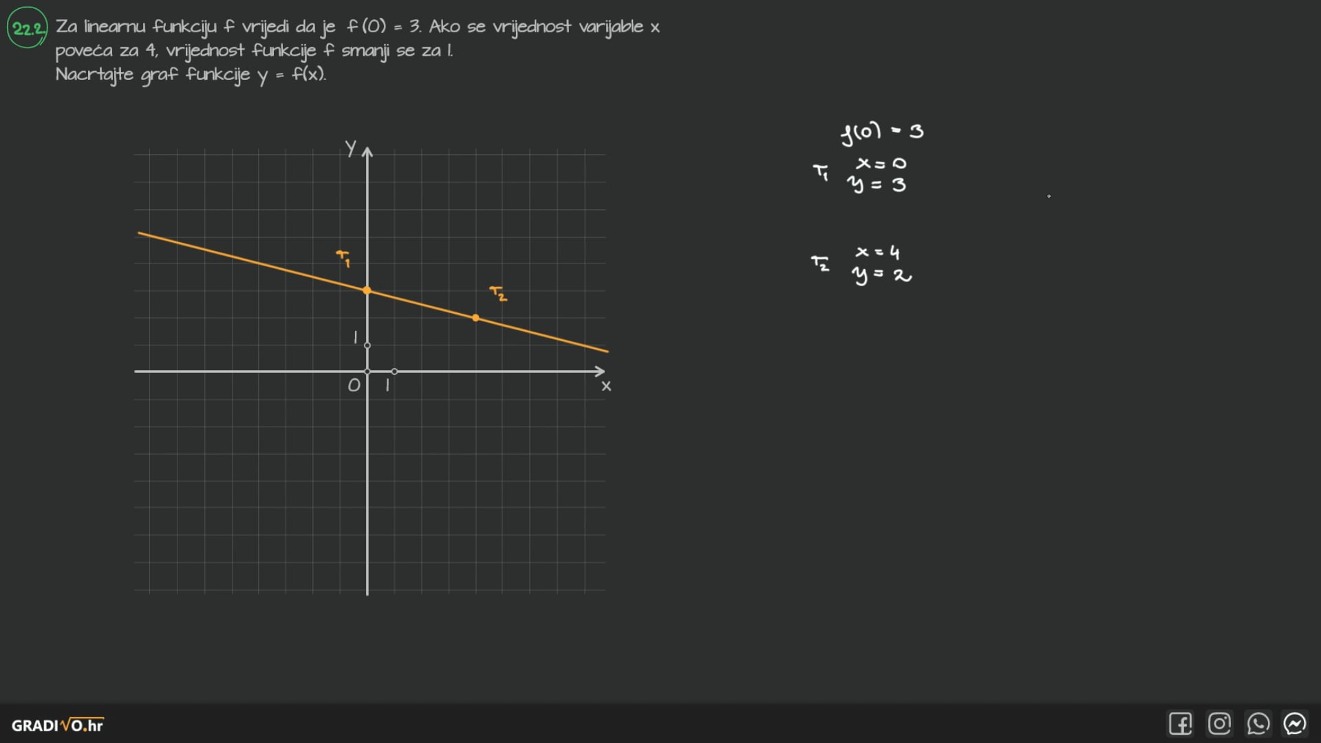 Za linearnu funkciju $f$ vrijedi da je $f(0)=3$. Ako se vrijednost varijable $x$ poveća za 4 , vrijednost funkcije $f$ smanji se za 1.