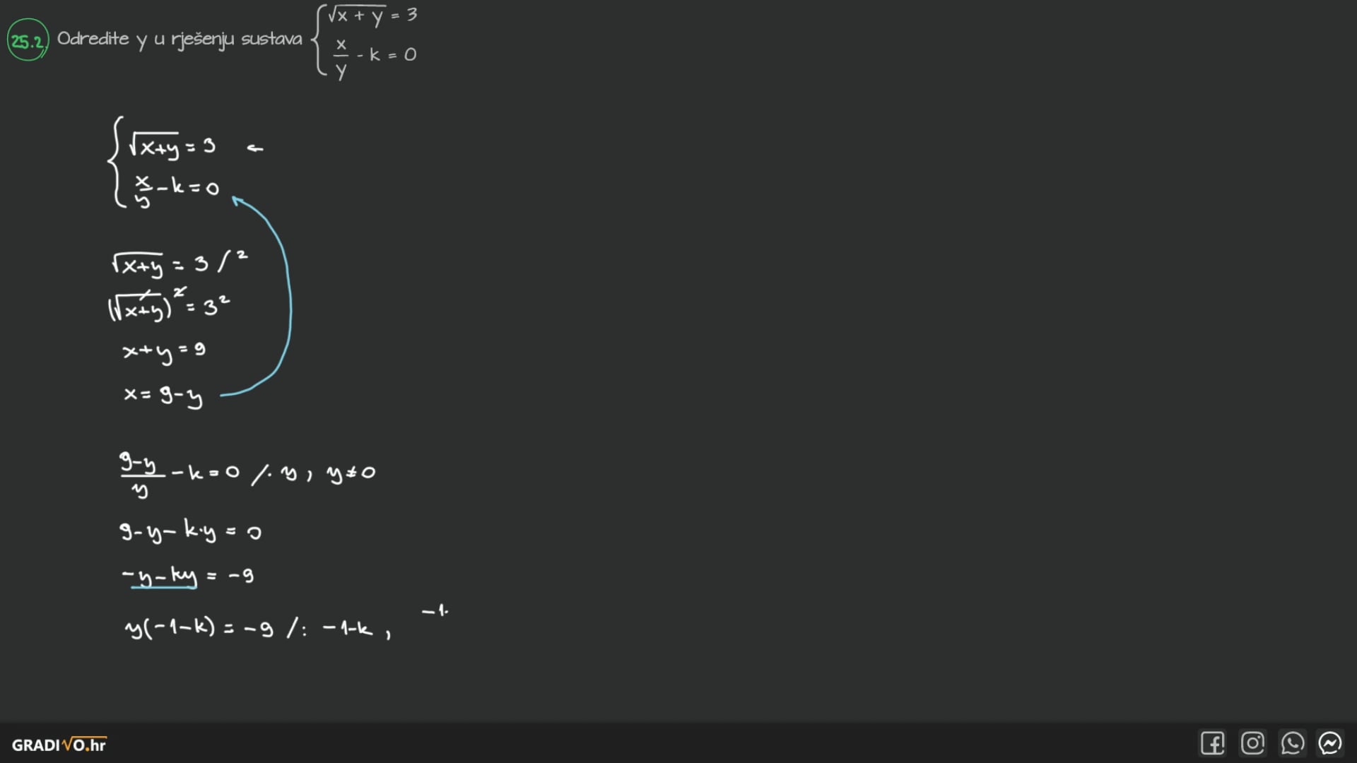 Odredite $y$ u rješenju sustava $\left\{\begin{array}{l}\sqrt{x+y}=3 \\ \frac{x}{y}-k=0\end{array}\right.$.