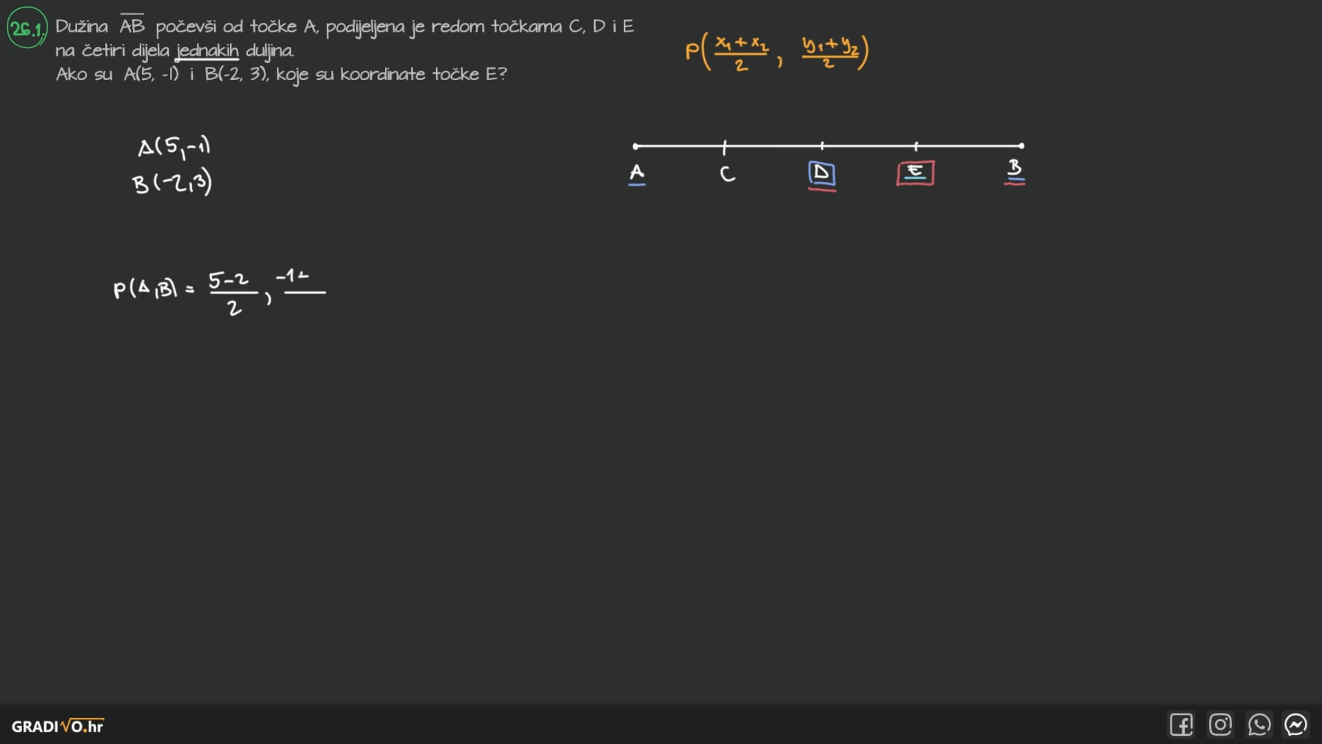 Dužina $\overline{A B}$, počevši od točke $A$, podijeljena je redom točkama $C, D$ i $E$na četiri dijela jednakih duljina. Ako su $A(5,-1)$ i $B(-2,3)$, koje su koordinate točke $E$ ?