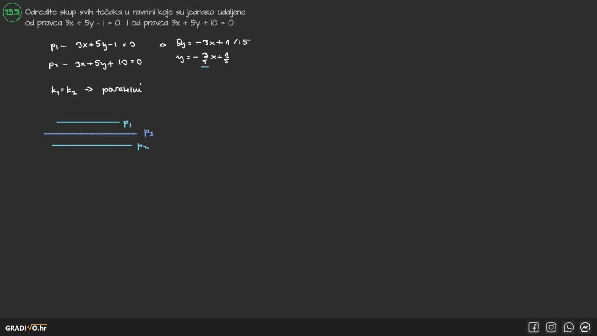 Odredite skup svih točaka u ravnini koje su jednako udaljene od pravca $3 x+5 y-1=0$ i od pravca $3 x+5 y+10=0$.