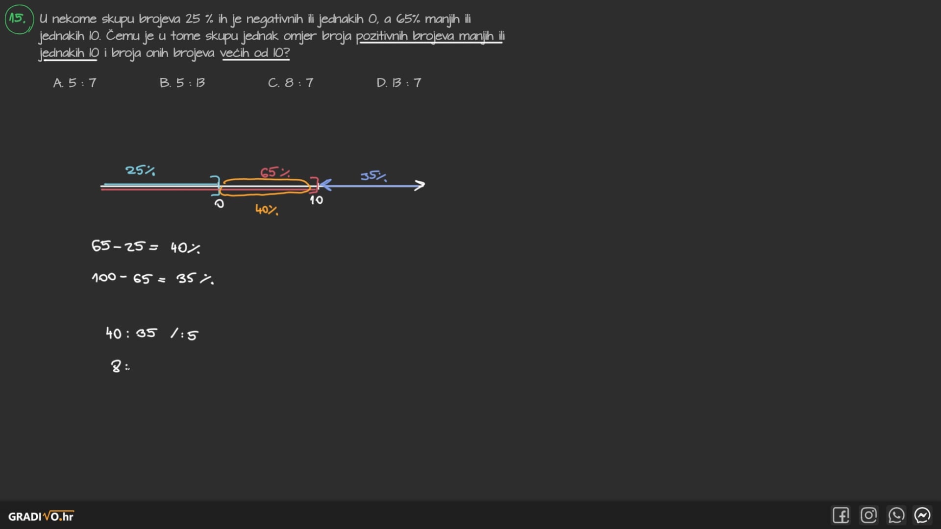 U nekome skupu brojeva $25 \%$ ih je negativnih ili jednakih 0 , a $65 \%$ manjih ili jednakih 10. Čemu je u tome skupu jednak omjer broja pozitivnih brojeva manjih ili jednakih 10 i broja onih brojeva većih od 10 ?
