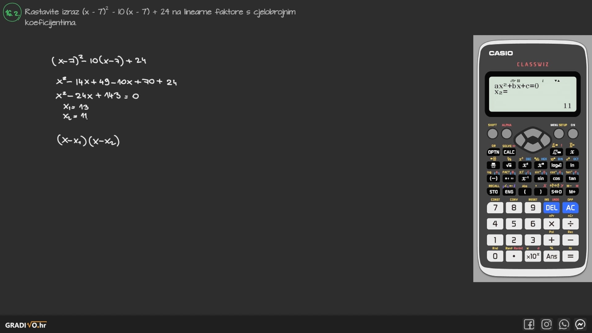 Rastavite izraz $(x-7)^{2}-10(x-7)+24$ na linearne faktore s cjelobrojnim koeficijentima.