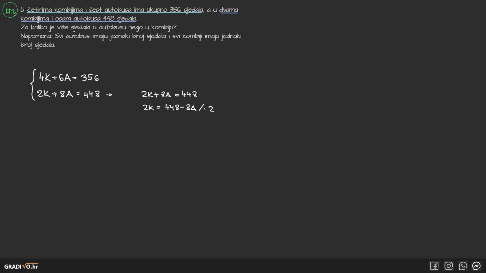 U četirima kombijima i šest autobusa ima ukupno 356 sjedala, a u dvoma kombijima i osam autobusa 448 sjedala. Za koliko je više sjedala u autobusu nego u kombiju?