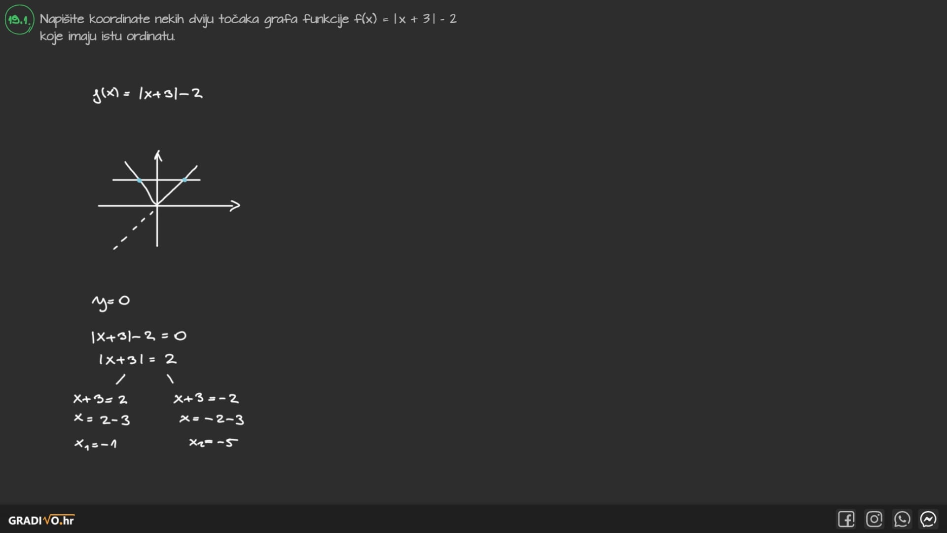 Napišite koordinate nekih dviju točaka grafa funkcije $f(x)=|x+3|-2$ koje imaju istu ordinatu.