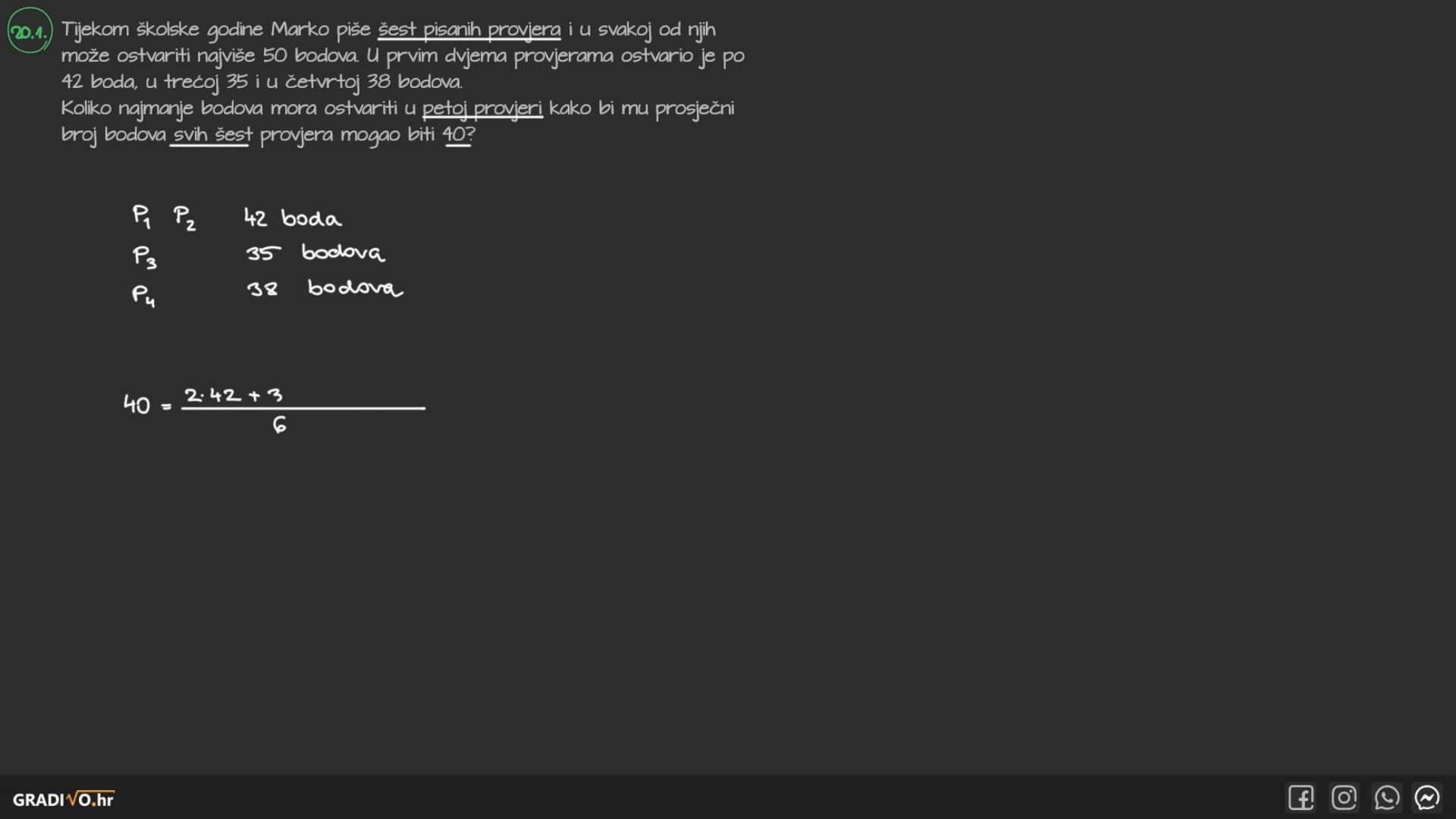 Tijekom školske godine Marko piše šest pisanih provjera i u svakoj od njih može ostvariti najviše 50 bodova. U prvim dvjema provjerama ostvario je po 42 boda, u trećoj 35 i u četvrtoj 38 bodova. Koliko najmanje bodova mora ostvariti u petoj provjeri kako bi mu prosječni broj bodova svih šest provjera mogao biti 40 ?