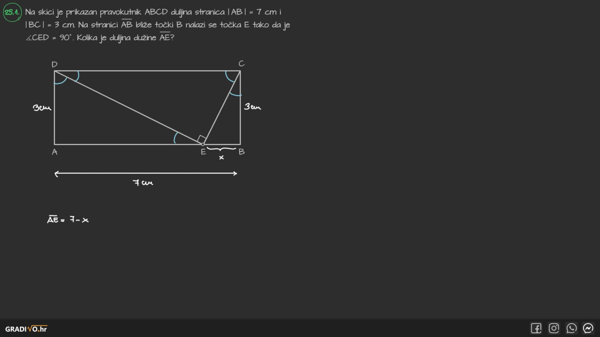 Na skici je prikazan pravokutnik $A B C D$ duljina stranica $|A B|=7 \mathrm{~cm} \mathrm{i}$ $|B C|=3 \mathrm{~cm}$. Na stranici $\overline{A B}$ bliže točki $B$ nalazi se točka $E$ tako da je $\angle C E D=90^{\circ}$. Kolika je duljina dužine $\overline{A E}$ ?