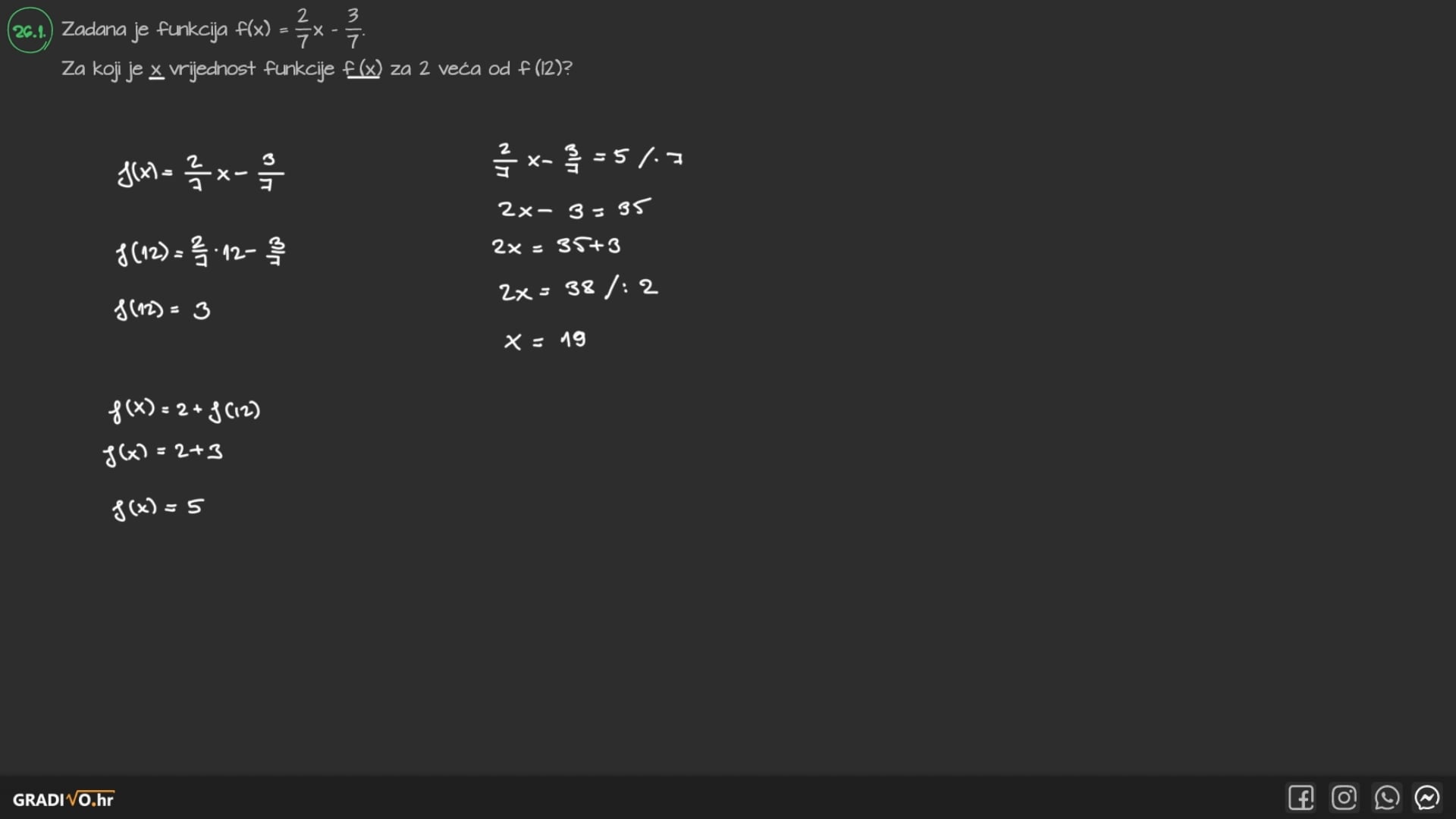 Zadana je funkcija $f(x)=\frac{2}{7} x-\frac{3}{7}$.