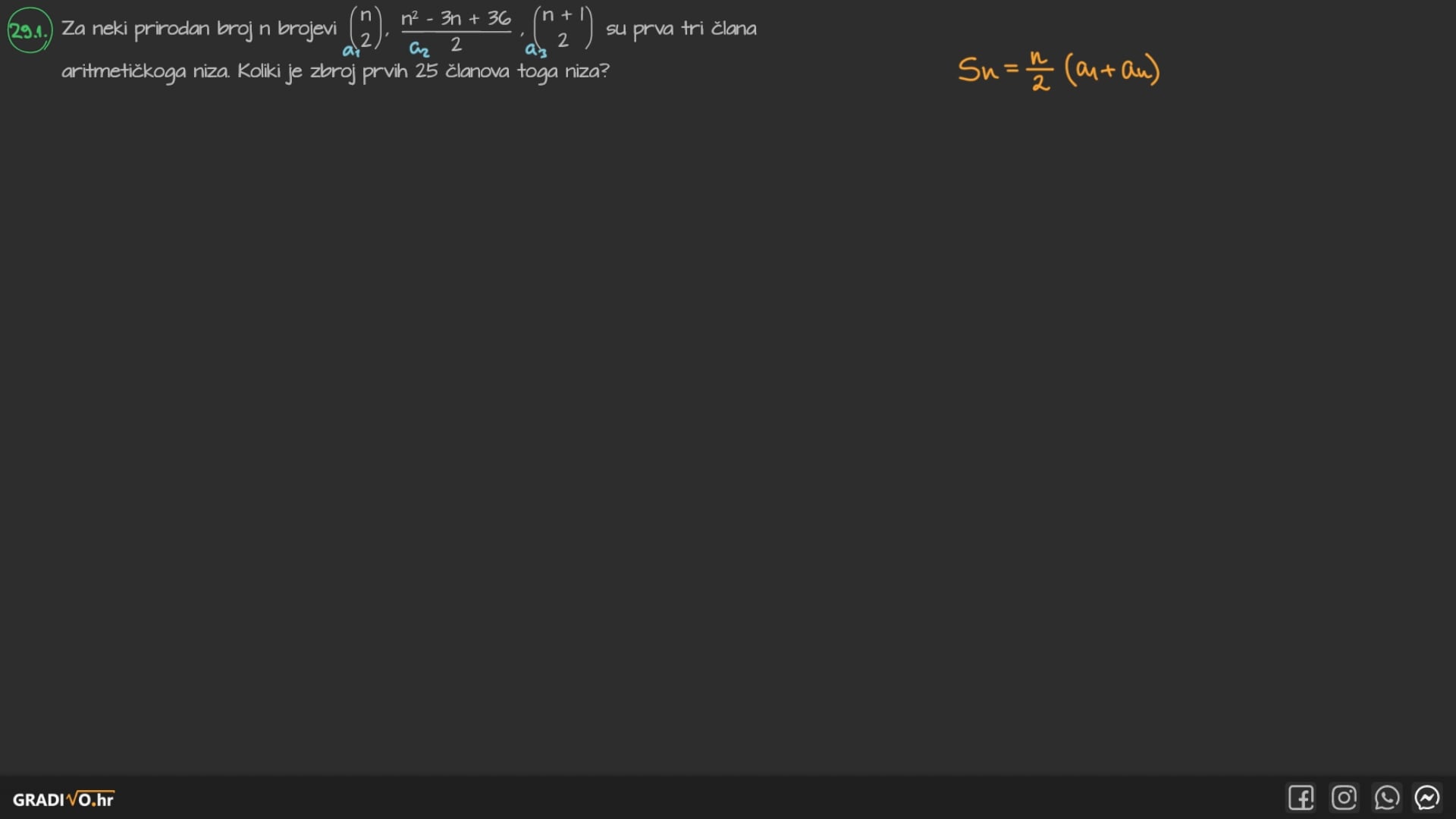 Za neki prirodan broj $n$ brojevi $\binom{n}{2}, \frac{n^{2}-3 n+36}{2},\binom{n+1}{2}$ su prva tri člana aritmetičkoga niza. Koliki je zbroj prvih 25 članova toga niza?