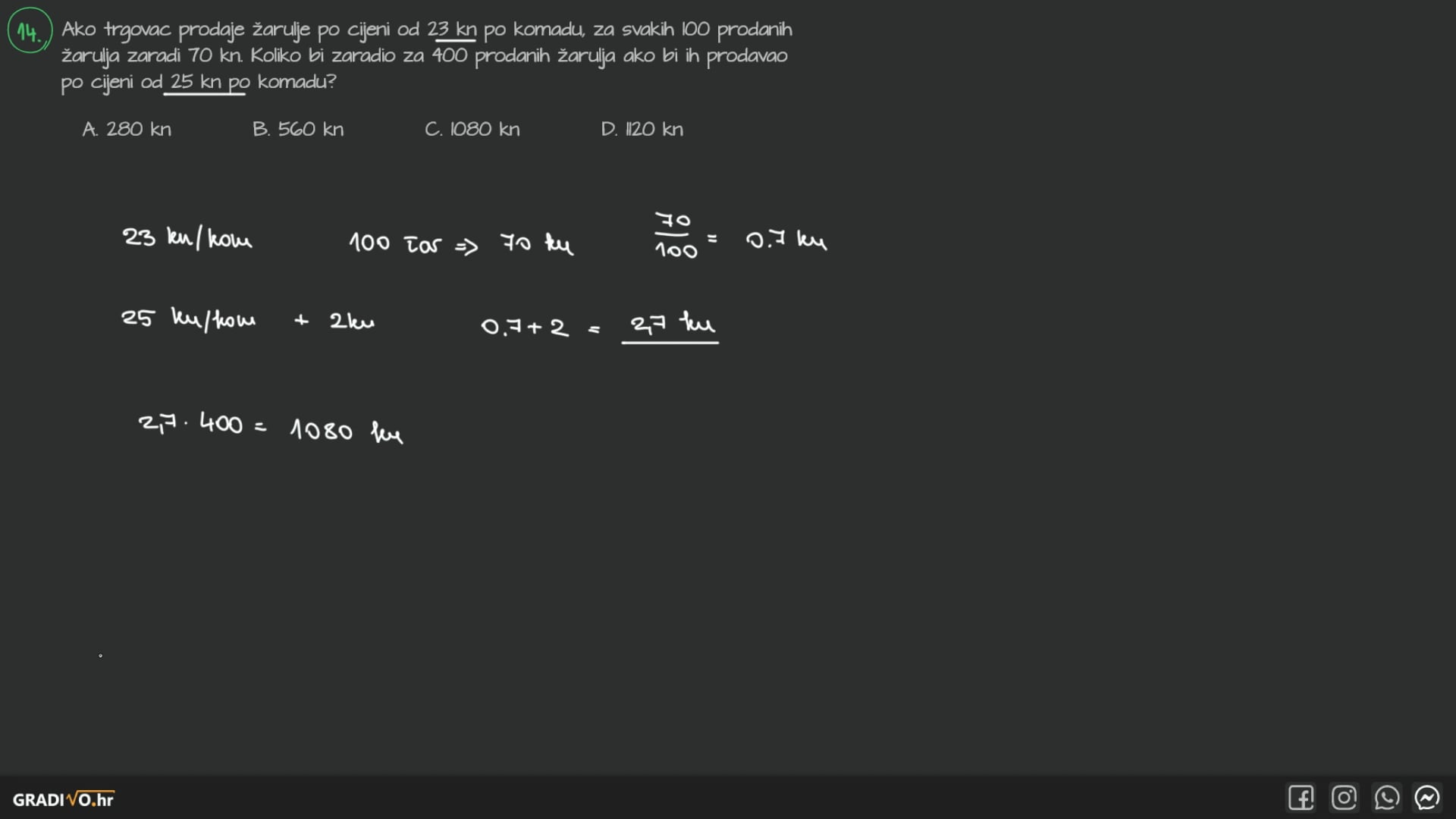 Ako trgovac prodaje žarulje po cijeni od 23 kn po komadu, za svakih 100 prodanih žarulja zaradi 70 kn . Koliko bi zaradio za 400 prodanih žarulja ako bi ih prodavao po cijeni od 25 kn po komadu?