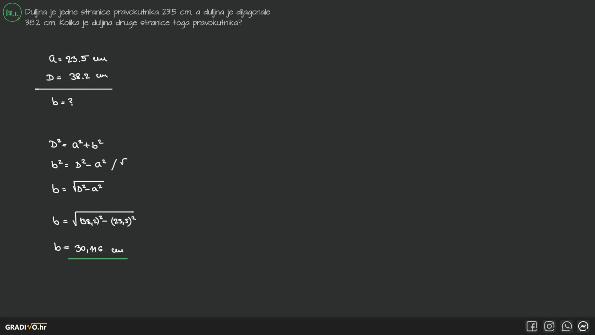 Duljina je jedne stranice pravokutnika 23.5 cm, a duljina je dijagonale 38.2 cm. Kolika je duljina druge stranice toga pravokutnika?