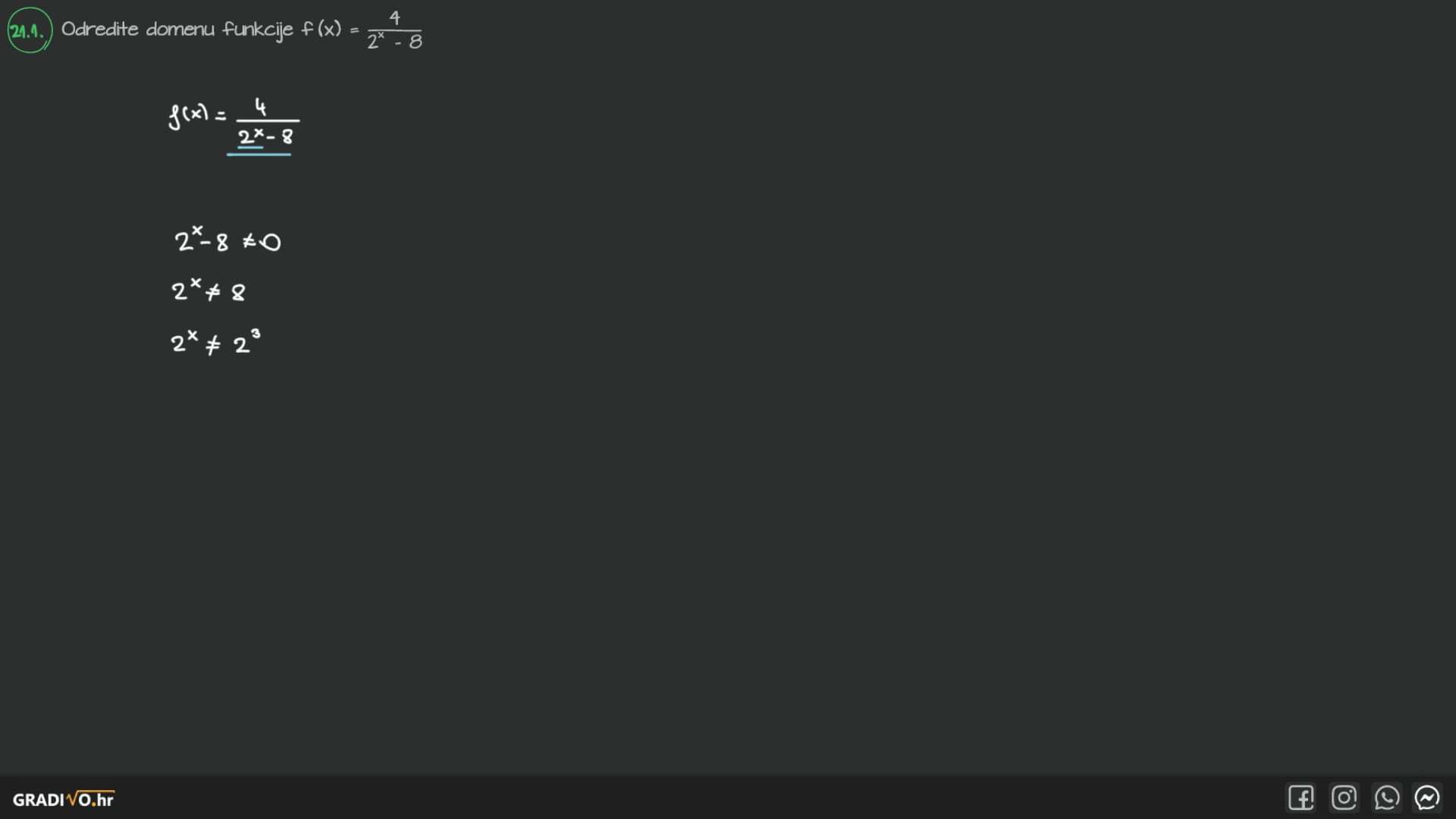 Odredite domenu funkcije $f(x)=\frac{4}{2^{x}-8}$.