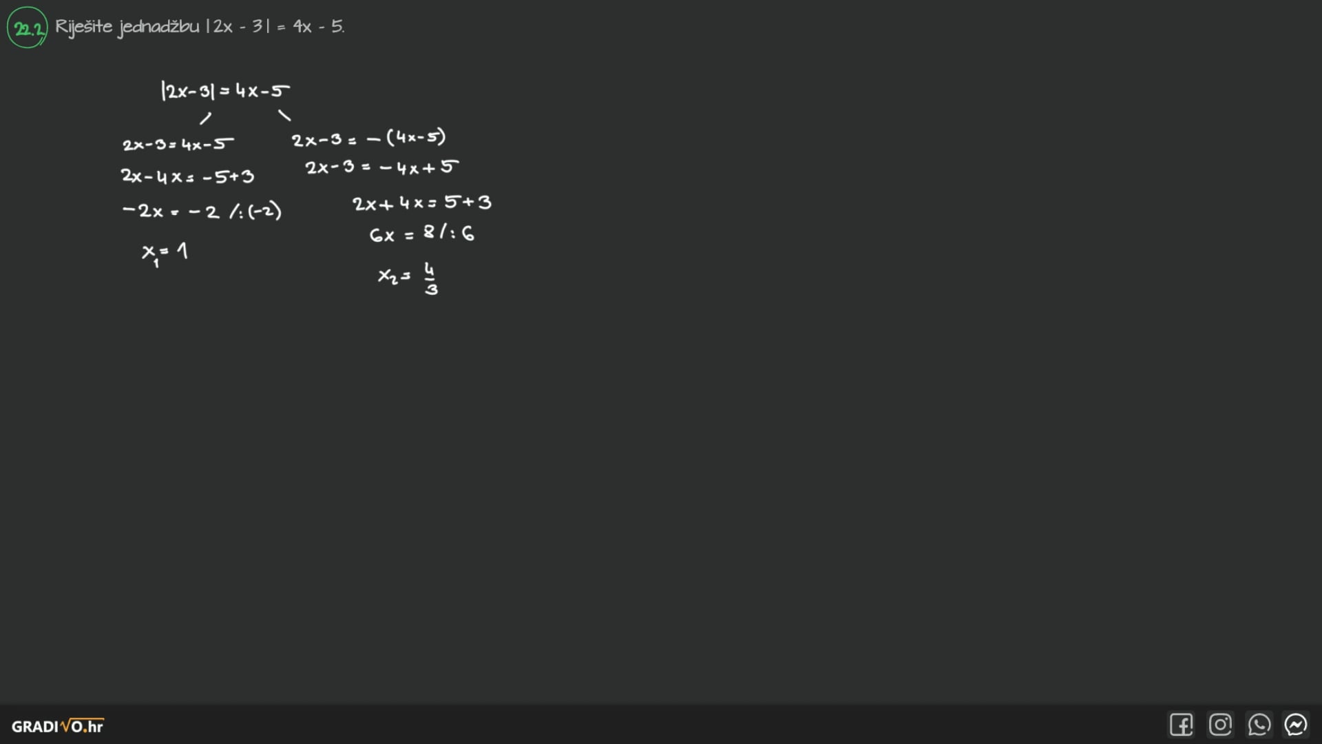 Riješite jednadžbu $|2 x-3|=4 x-5$.