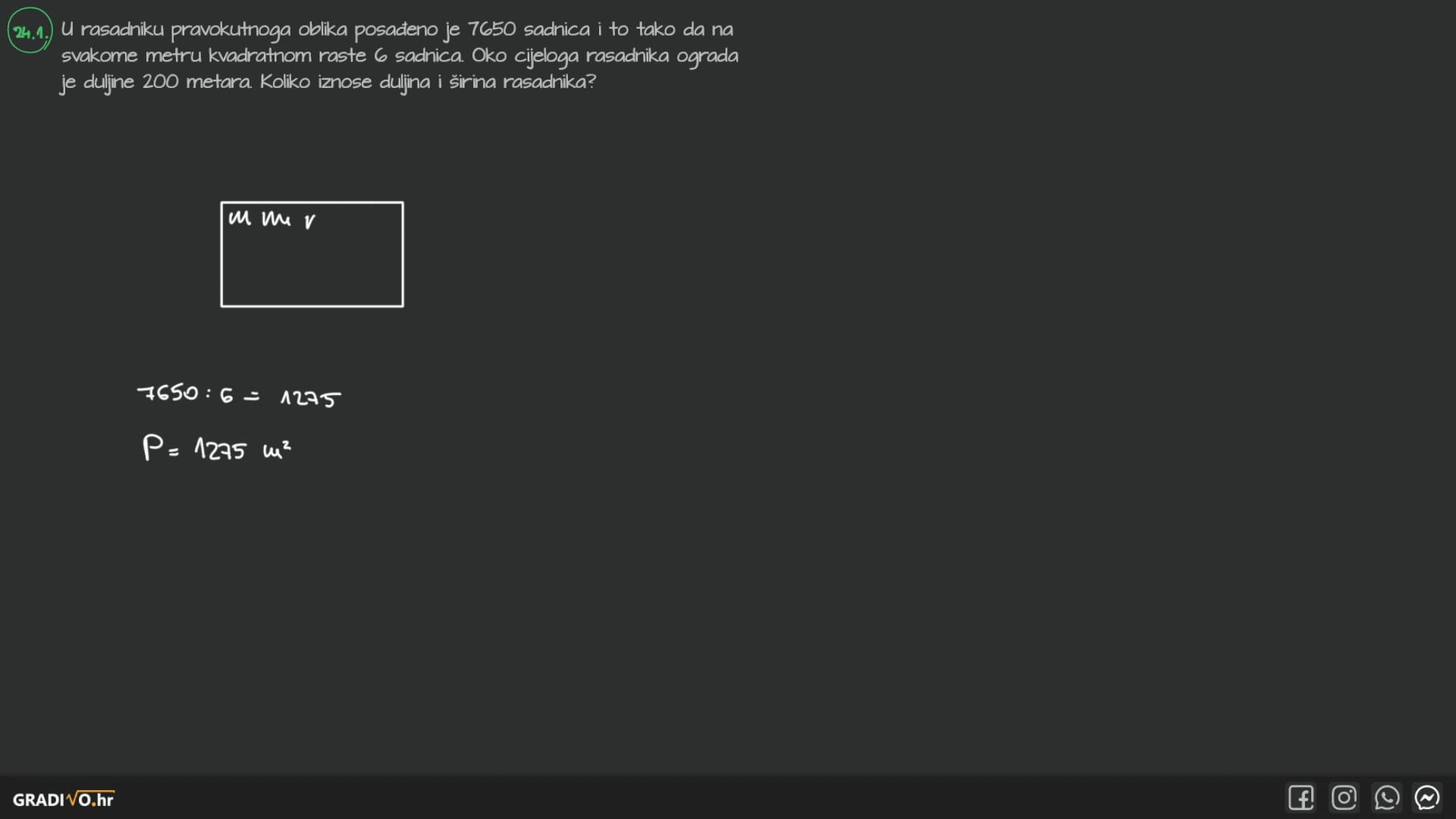U rasadniku pravokutnoga oblika posađeno je 7650 sadnica i to tako da na svakome metru kvadratnom raste 6 sadnica. Oko cijeloga rasadnika ograda je duljine 200 metara. Koliko iznose duljina i širina rasadnika?