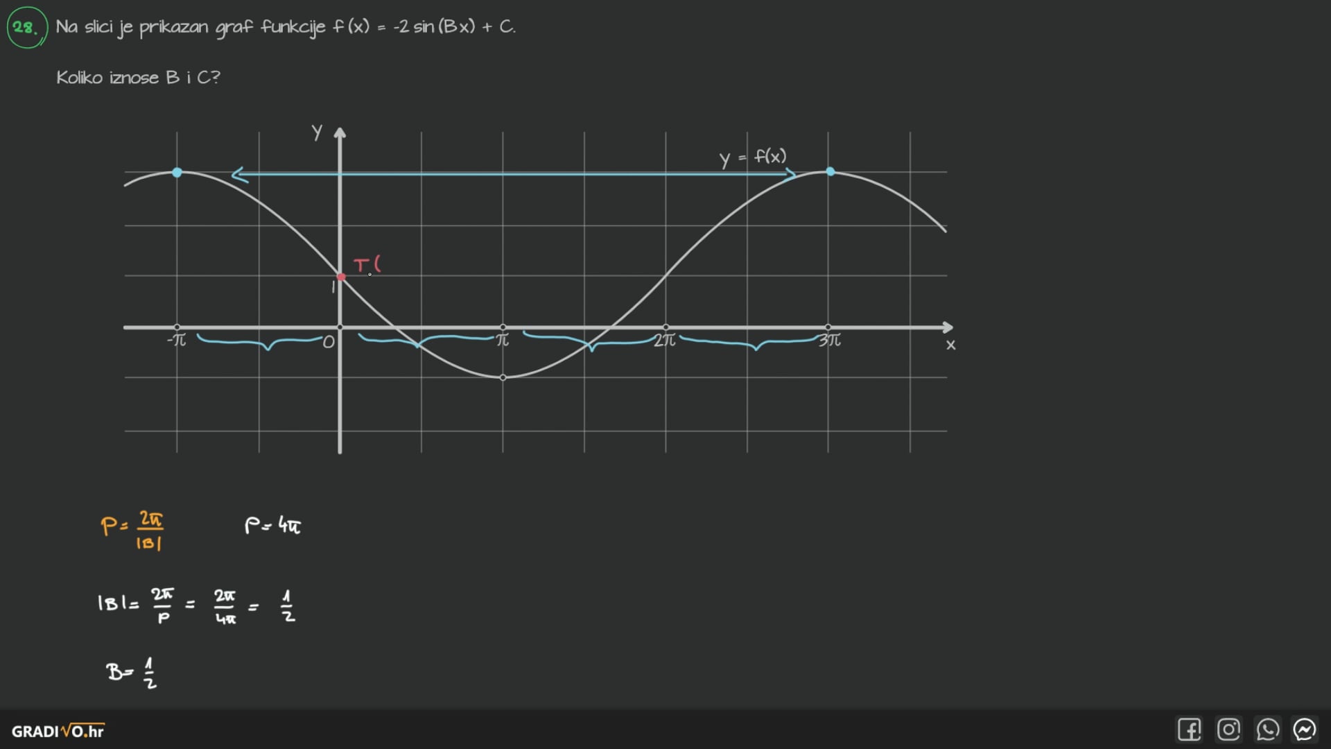 Na slici je prikazan graf funkcije $f(x)=-2 \sin (B x)+C$.