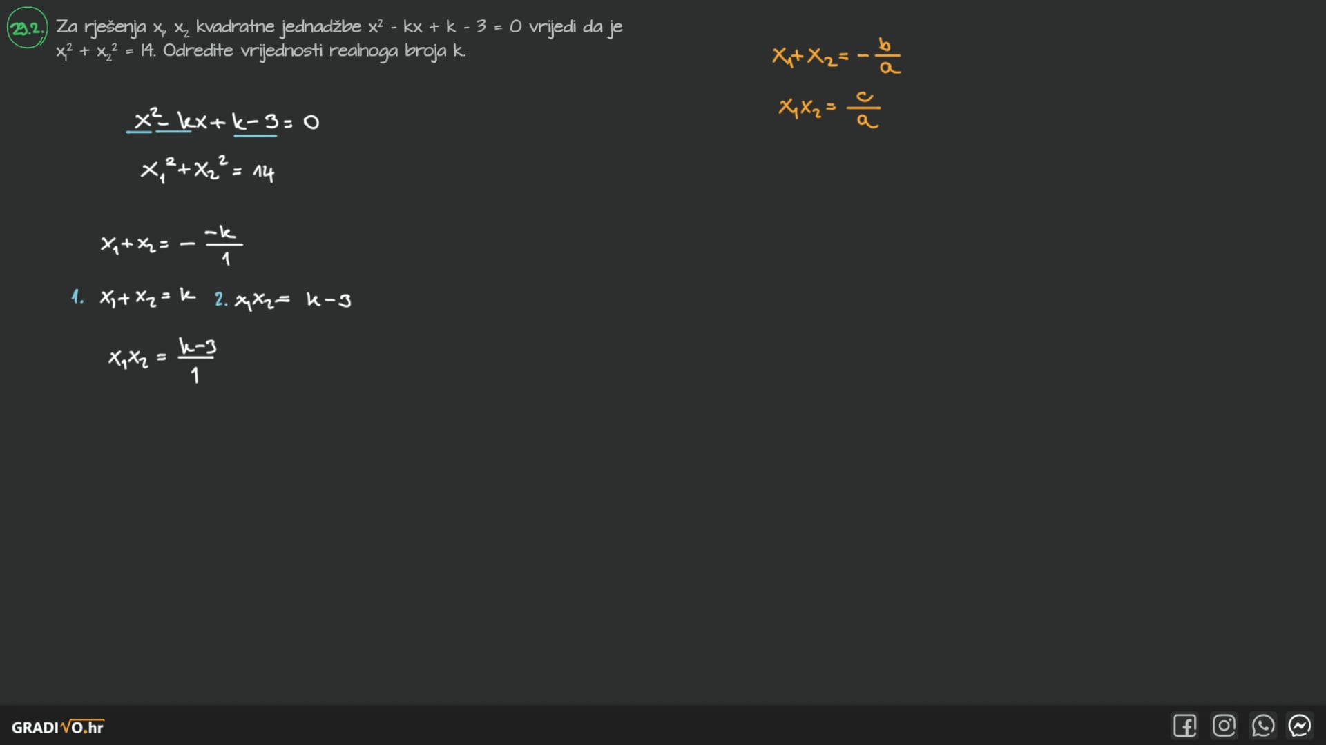 Za rješenja $x_{1}, x_{2}$ kvadratne jednadžbe $x^{2}-k x+k-3=0$ vrijedi da je $x_{1}^{2}+x_{2}^{2}=14$. Odredite vrijednosti realnoga broja $k$.