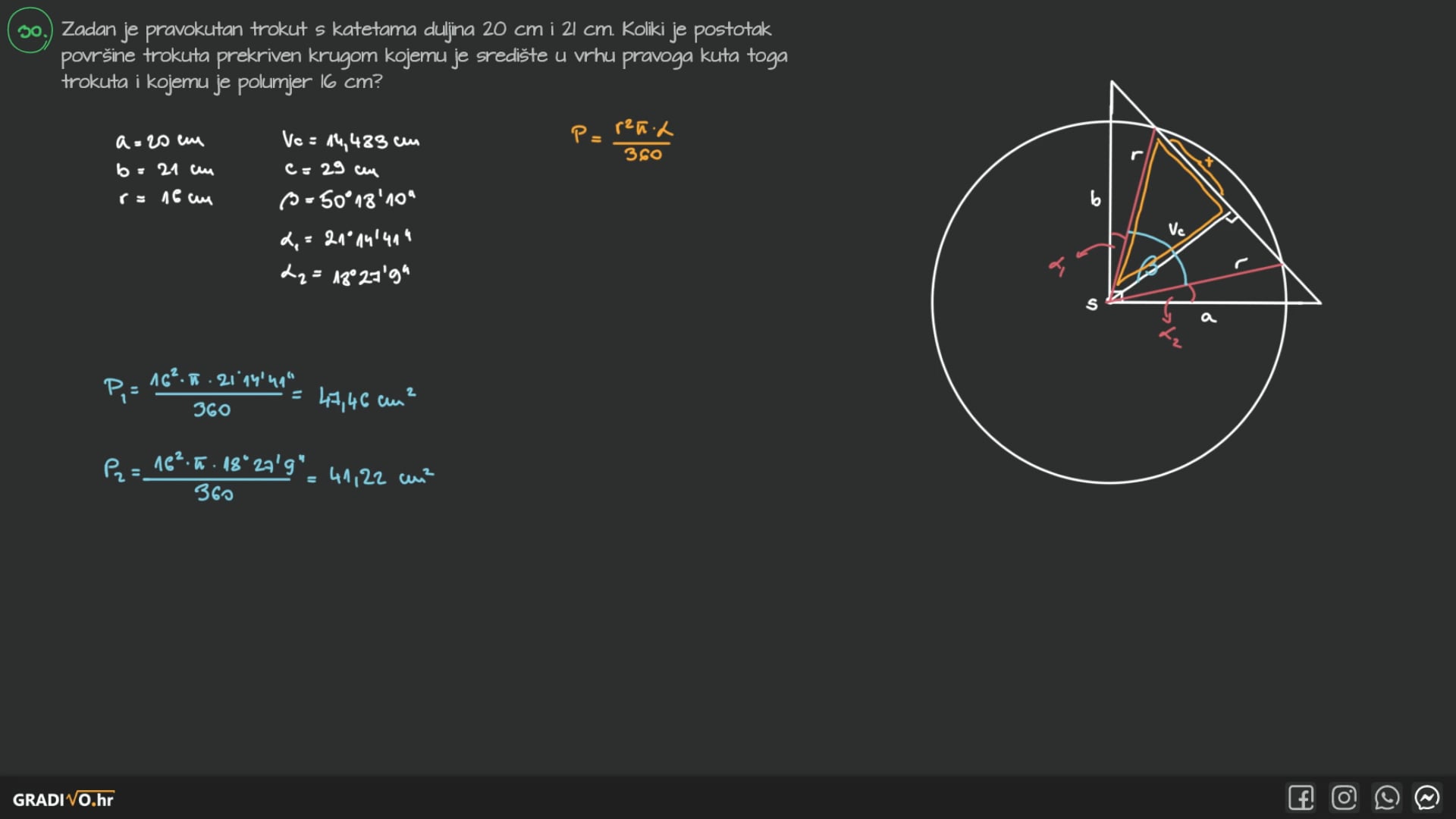 Zadan je pravokutan trokut s katetama duljina 20 cm i 21 cm . Koliki je postotak površine trokuta prekriven krugom kojemu je središte u vrhu pravoga kuta toga trokuta i kojemu je polumjer 16 cm ?
