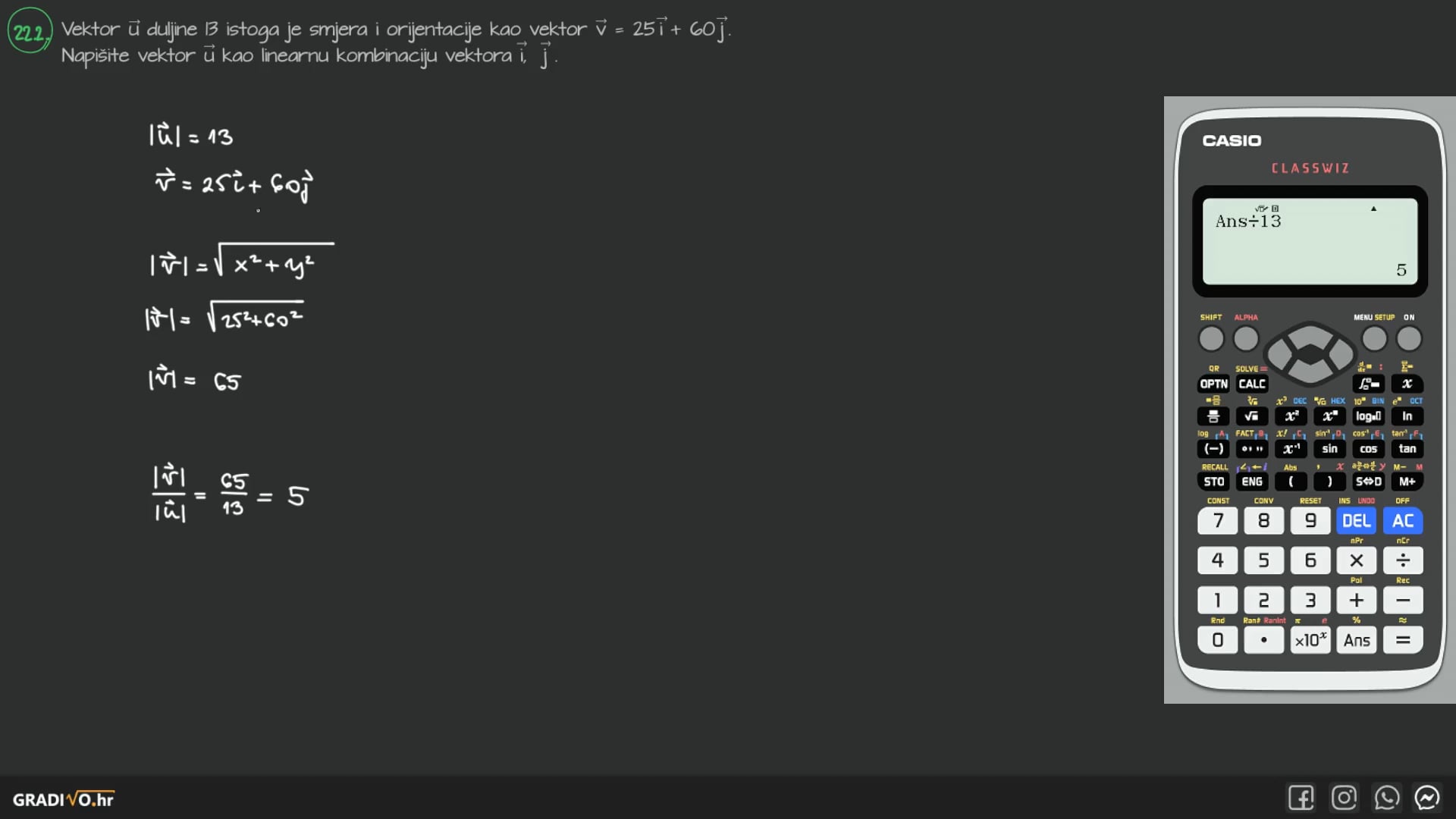Vektor $\vec{u}$ duljine 13 istoga je smjera i orijentacije kao vektor $\vec{v}=25 \vec{i}+60 \vec{j}$. Napišite vektor $\vec{u}$ kao linearnu kombinaciju vektora $\vec{i}$ i $\vec{j}$.