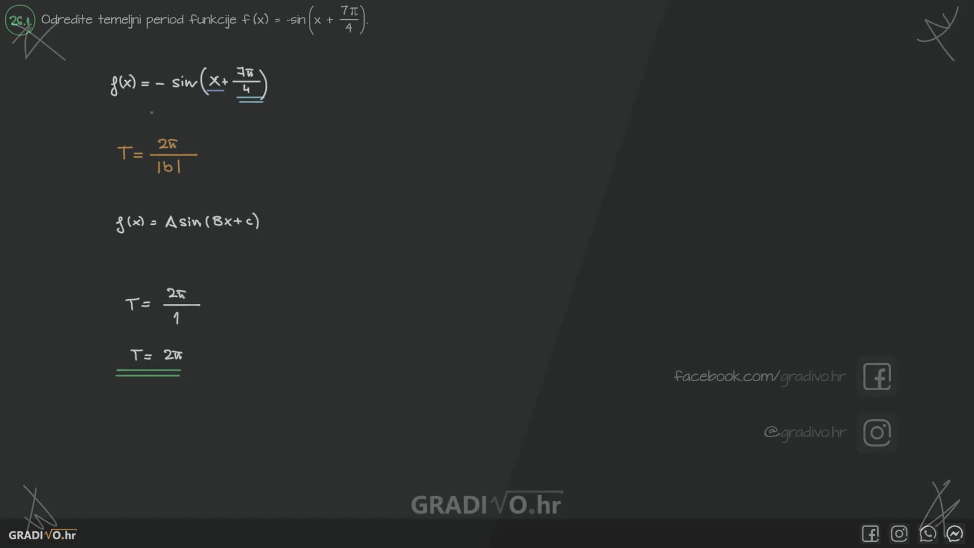Odredite temeljni period funkcije $f(x)=-\sin \left(x+\frac{7 \pi}{4}\right)$.