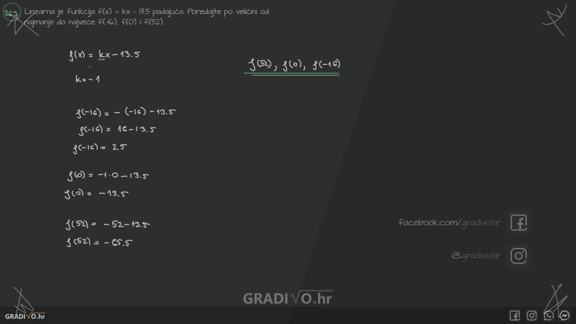 Linearna je funkcija $f(x)=k x-13.5$ padajuća. Poredajte po veličini od najmanje do najveće $f(-16), f(0)$ i $f(52)$.