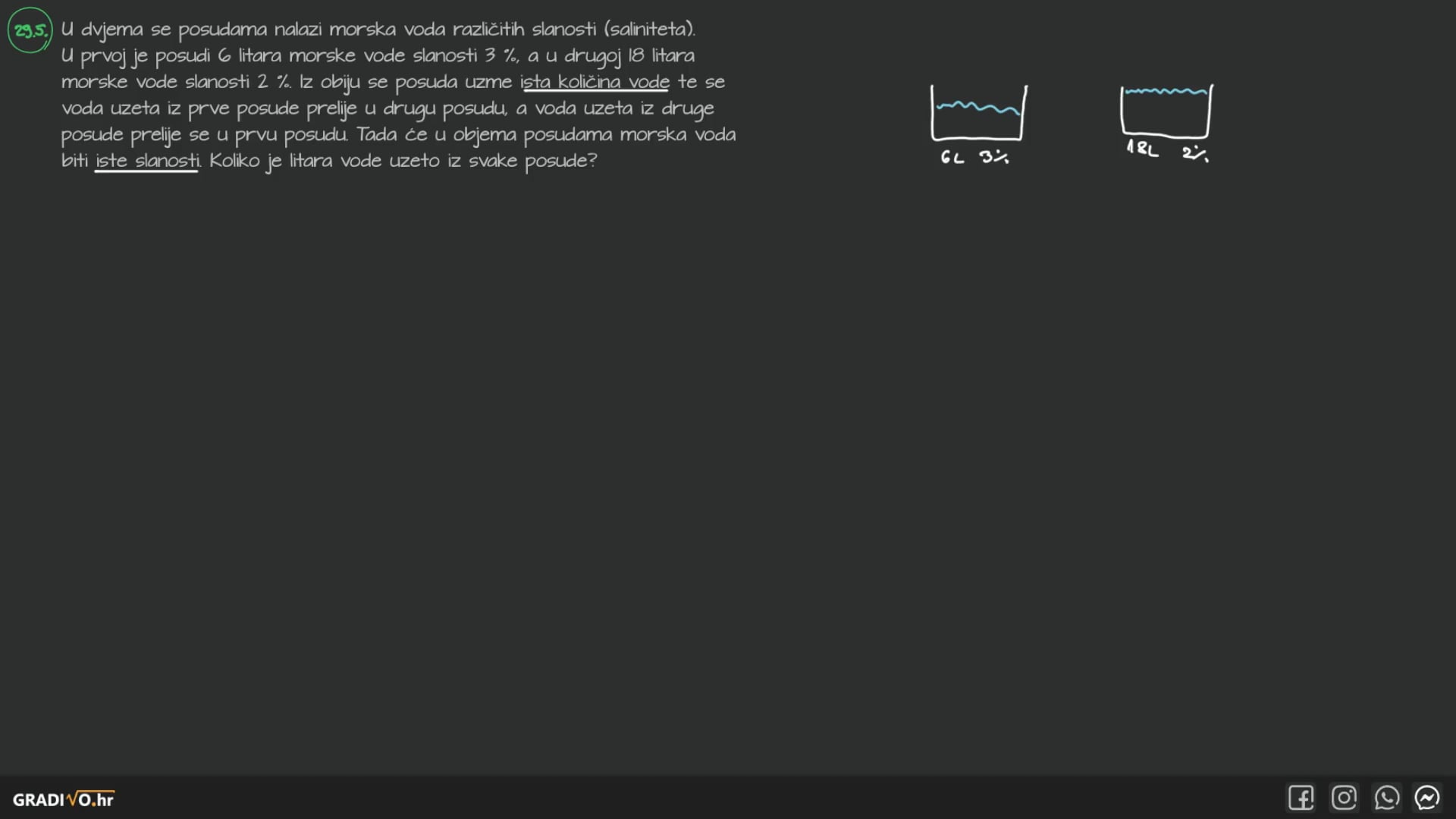 U dvjema se posudama nalazi morska voda različitih slanosti (saliniteta). U prvoj je posudi 6 litara morske vode slanosti $3 \%$, a u drugoj 18 litara morske vode slanosti $2 \%$. Iz obiju se posuda uzme ista količina vode te se voda uzeta iz prve posude prelije u drugu posudu, a voda uzeta iz druge posude prelije se u prvu posudu. Tada će u objema posudama morska voda biti iste slanosti. Koliko je litara vode uzeto iz svake posude?