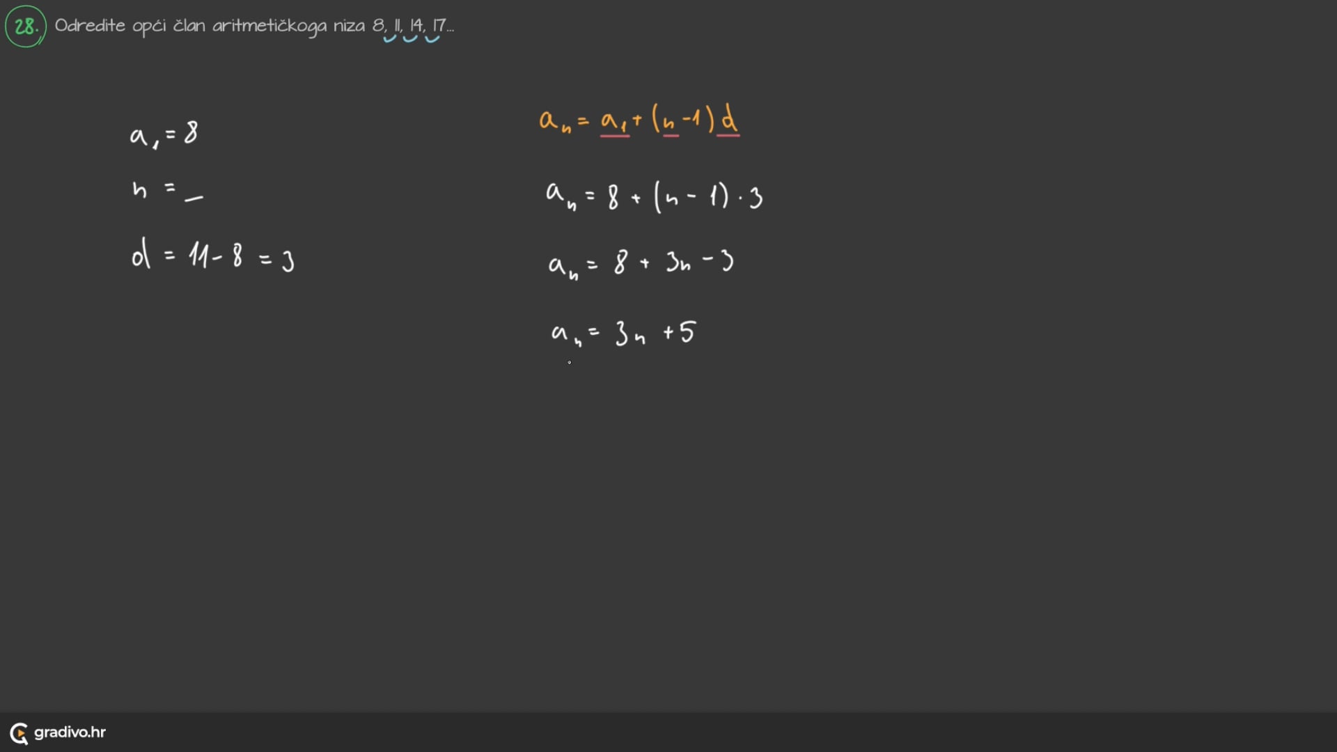 Odredite opći član aritmetičkoga niza $8,11,14,17 . $.