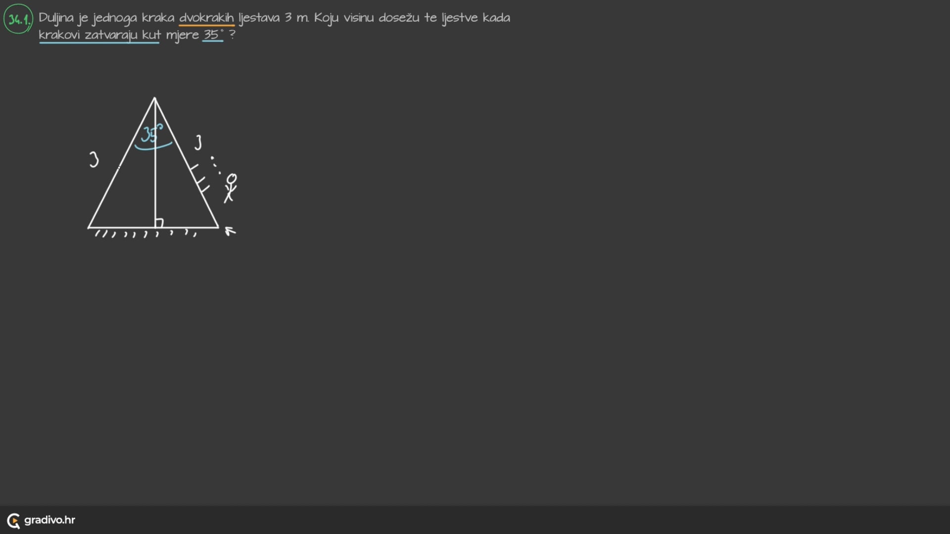 Duljina je jednoga kraka dvokrakih ljestava 3 m . Koju visinu dosežu te ljestve kada krakovi zatvaraju kut mjere $35^{\circ}$ ?
