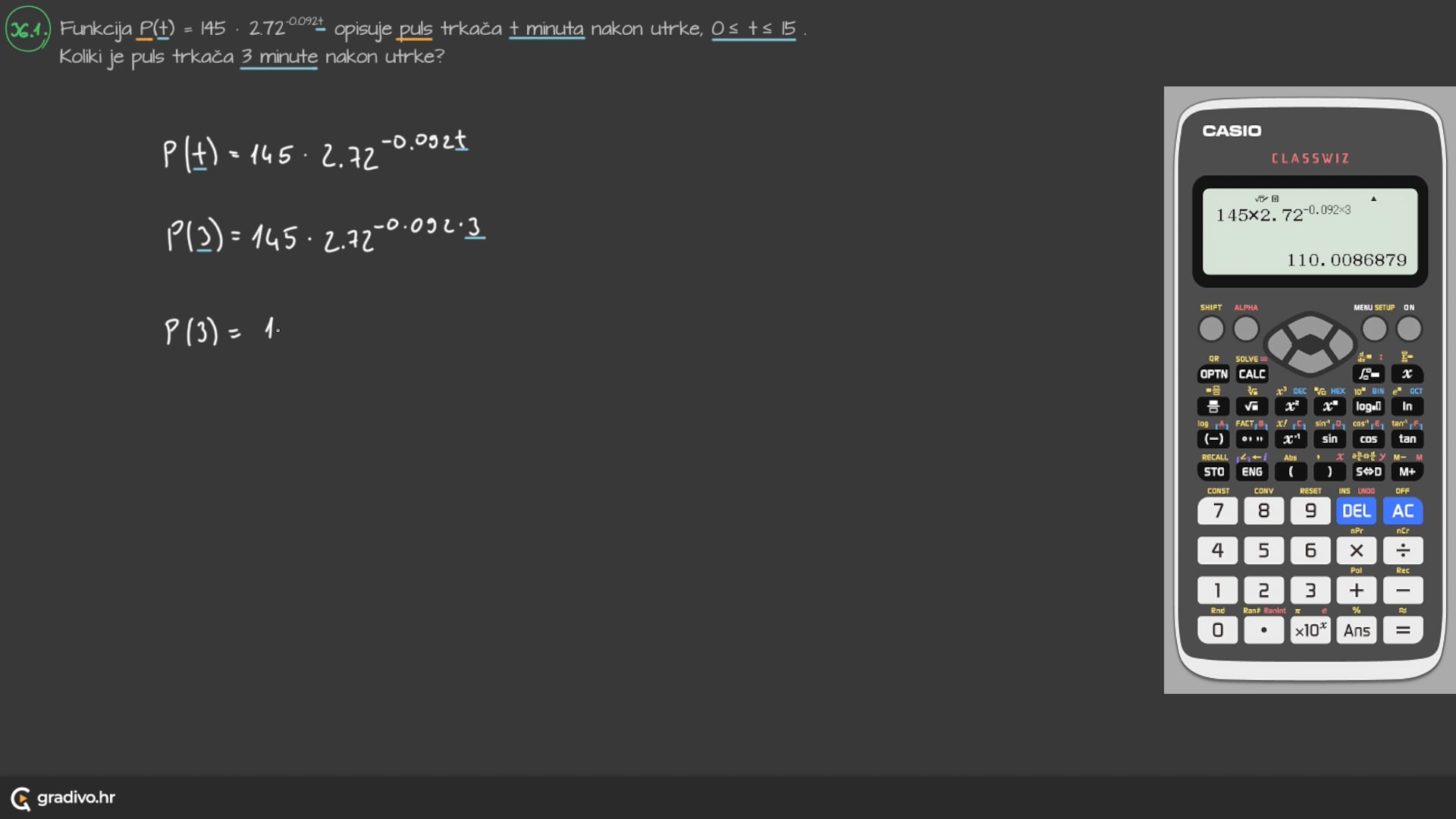 Funkcija $P(t)=145 \cdot 2.72^{-0.000 t}$ opisuje puls trkača $t$ minuta nakon utrke, $0 \leq t \leq 15$. Koliki je puls trkača 3 minute nakon utrke?$