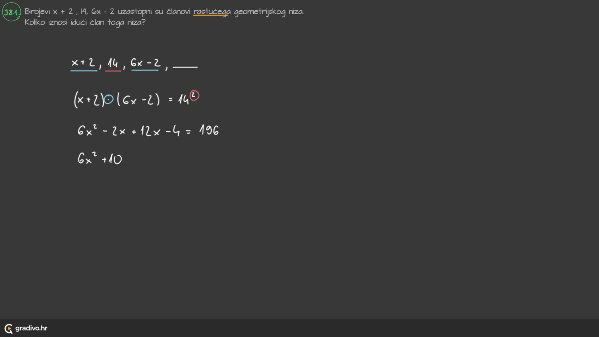 Brojevi $x+2,14,6 x-2$ uzastopni su članovi rastućega geometrijskog niza. Koliko iznosi idući član toga niza?