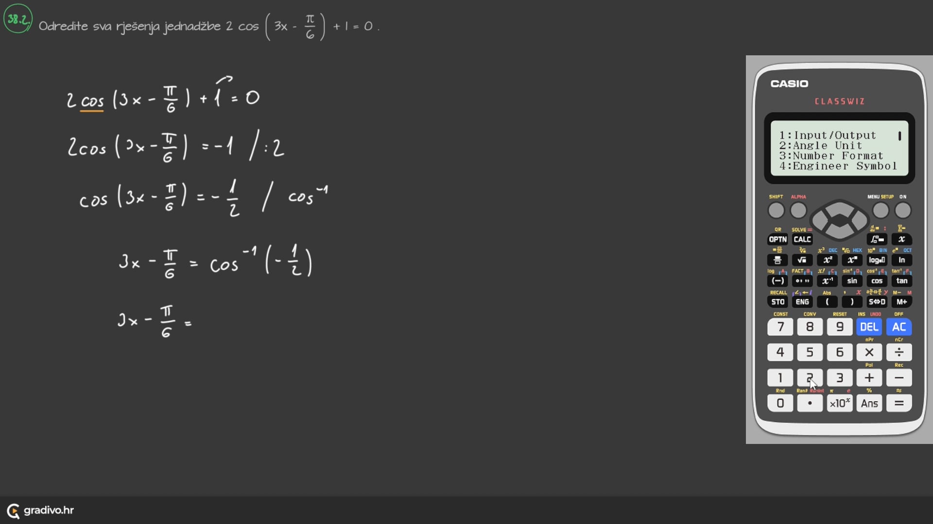 Odredite sva rješenja jednadžbe $2 \cos \left(3 x-\frac{\pi}{6}\right)+1=0$.
