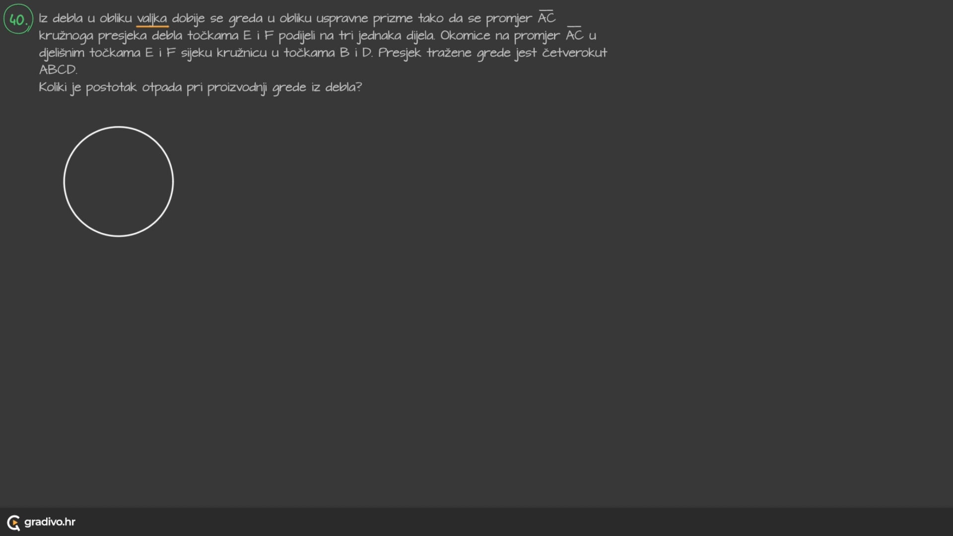 Iz debla u obliku valjka dobije se greda u obliku uspravne prizme tako da se promjer $\overline{A C}$ kružnoga presjeka debla točkama $E$ i $F$ podijeli na tri jednaka dijela. Okomice na promjer $\overline{A C}$ u djelišnim točkama $E \mathrm{i} F$ sijeku kružnicu u točkama $B \mathrm{i} D$. Presjek tražene grede jest četverokut $A B C D$.
