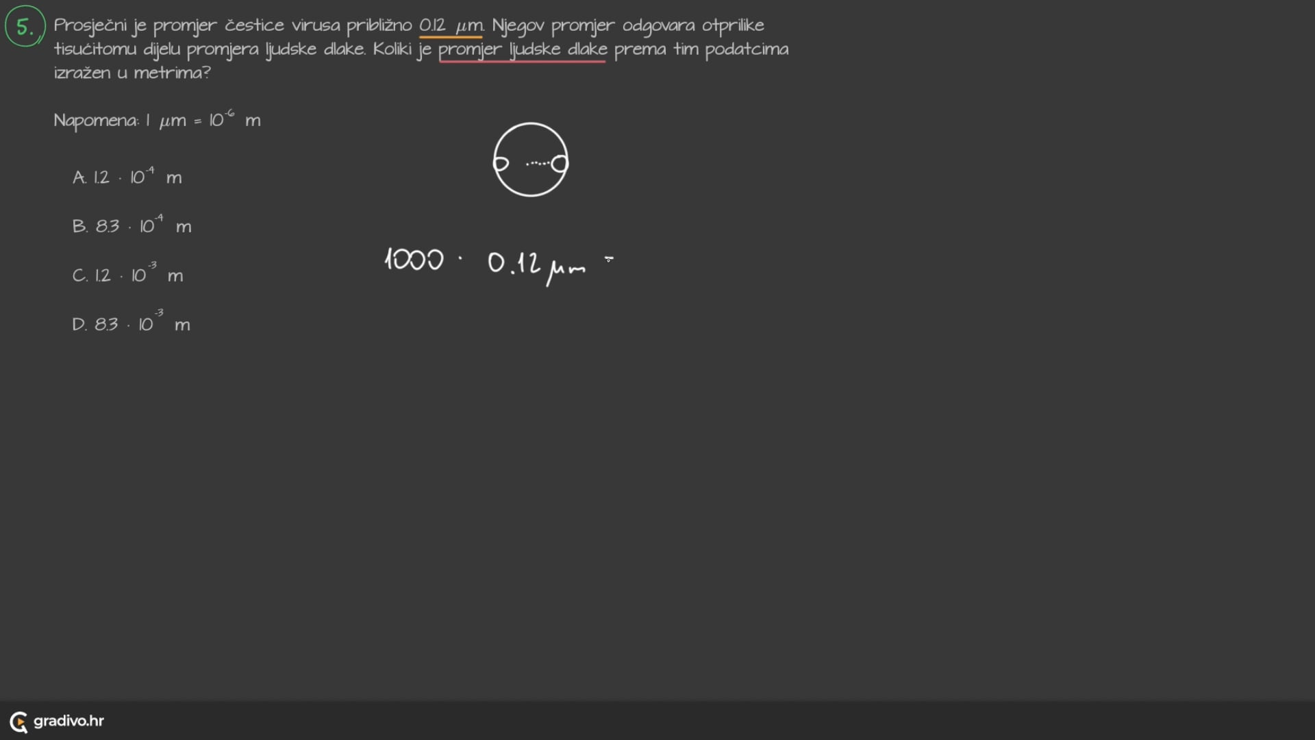 Prosječni je promjer čestice virusa približno $0.12 \mu \mathrm{~m}$. Njegov promjer odgovara otprilike tisućitomu dijelu promjera ljudske dlake. Koliki je promjer ljudske dlake prema tim podatcima izražen u metrima? Napomena: $1 \mu \mathrm{~m}=10^{-6} \mathrm{~m}$